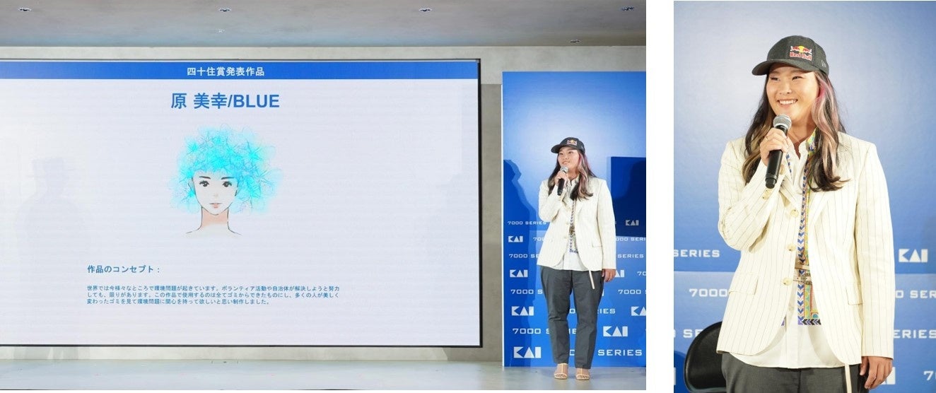 四十住選手は「どれも本当に素敵ですごいです。驚きも感じます。」とお話いただき、遠藤社長は「コーポレートカラーをこのように読み解かれて、このようなデザインに仕上げていただけて驚きと素晴らしいと感じました。」とコメント。冨永さんからは「オーシャンブルーという1つのテーマとしても頭を悩ませて、色々なイメージをしてくれたんだとみて取れますね。」とお話いただきました。また、特別審査員としてご登壇いただいた株式会社栗原社長の栗原さんは「どの作品も環境への配慮しながら、独創的な作品を考えていただき、まだまだ広がりがあるなと考えました。」とご感想いただき、最後は日爪さんに「どの作品も素敵なデザインのものがたくさんあって、帽子の深さを感じられました。デザインの世界観から、実物になった時にどのような広がりがあるのか、楽しみです。」と総評のコメントをいただきました。