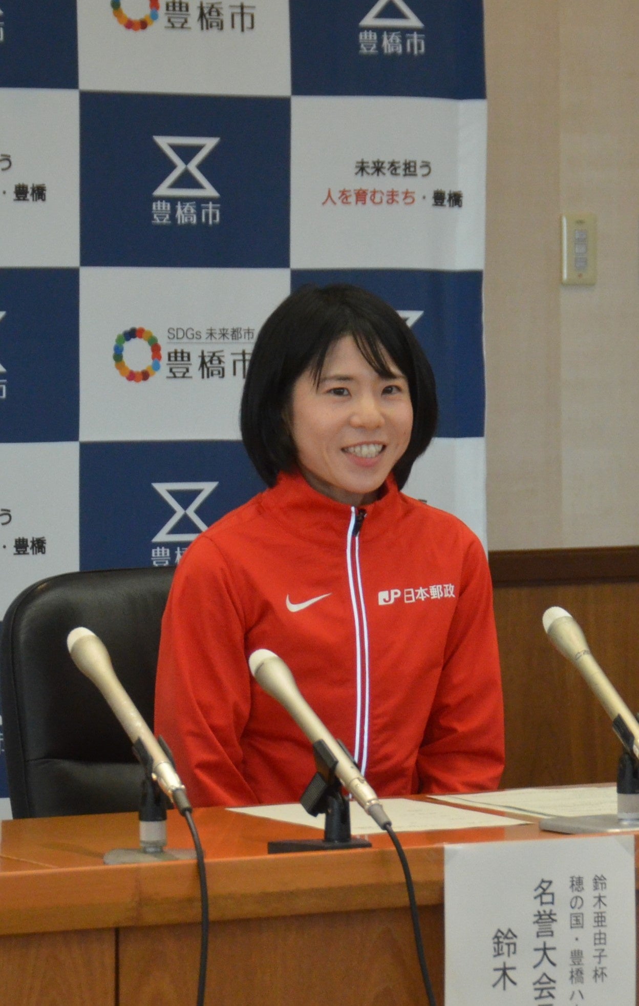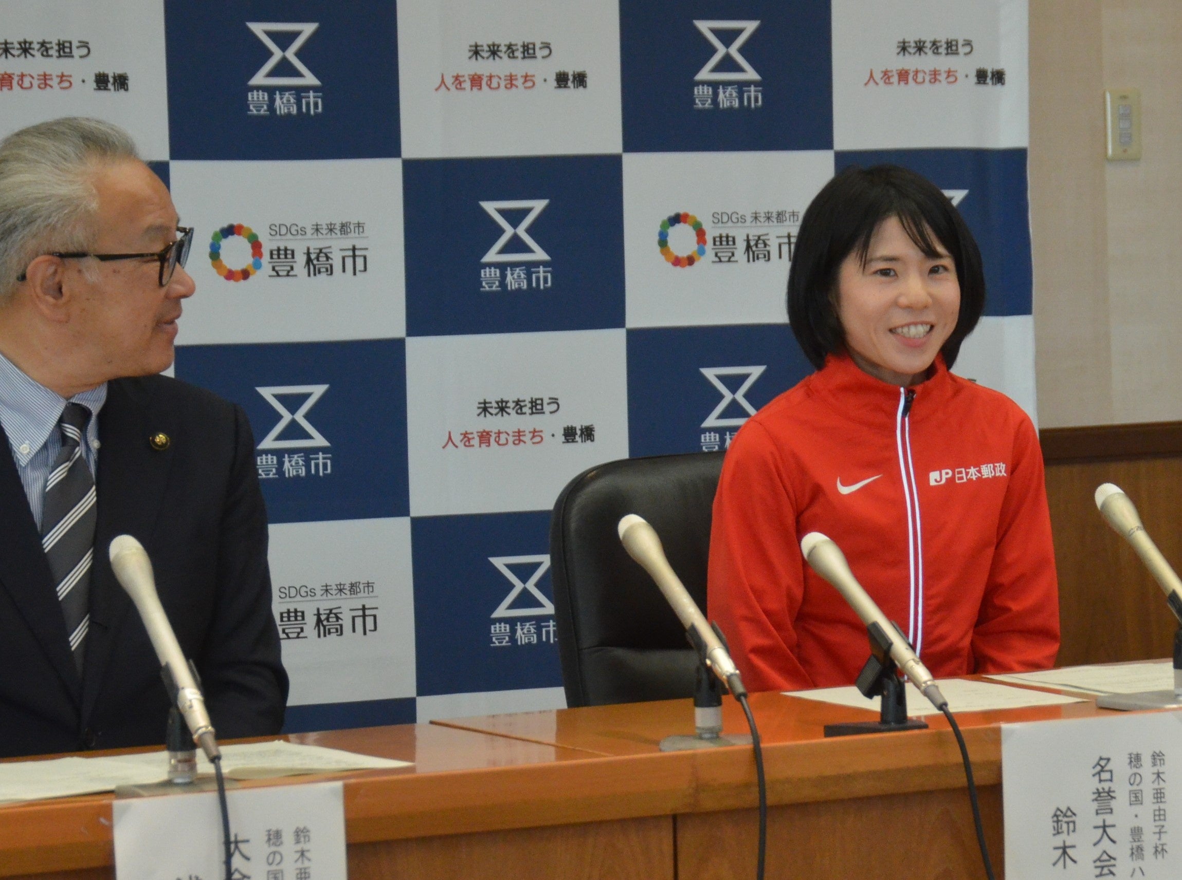 会見には、日本郵政グループ女子陸上部の髙橋昌彦監督も同席。スポーツを通じて地域を元気にするなど日本郵政の取り組みを説明し、「地元の皆さんがあっての鈴木亜由子。穂の国・豊橋ハーフマラソンに協力するのは恩返しする機会」と話しました。