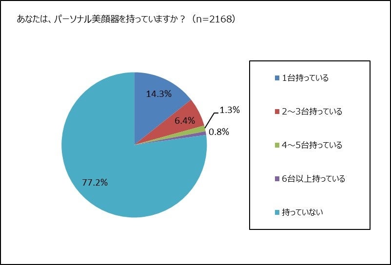 全国の20歳~64歳の女性2,168名にパーソナル美顔器を持っているか否か聞きました。1台持っている人が14.3%で2~3台持っている人は6.4%でした。持っていないと答えた人は77.2%だったことから、持っている人は22.8%でした。当社が2021年2月に20歳~59歳の女性2,125名を対象にした調査では、31.2%の人が持っていると答えていたため、8.4ポイント下がっていることがわかります。高齢層の美容意識の高まりもあり、今回の調査で対象年齢を5歳引き上げたことも若干影響していると思われますが、全体の美顔器の所有率は減少していることがわかります。