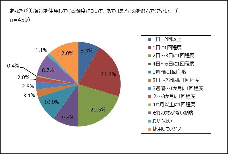 美顔器の使用頻度を聞きました。最も多いのは「1日に1回程度」で21.4%、「2~3日に1回程度」の20.5%と合わせると41.9%です。「1日に2回以上」の人も8.3%存在し、合わせると50.2%となり、使用している人の大半は、スキンケアをするように日常的に美顔器を使用していることがわかります。