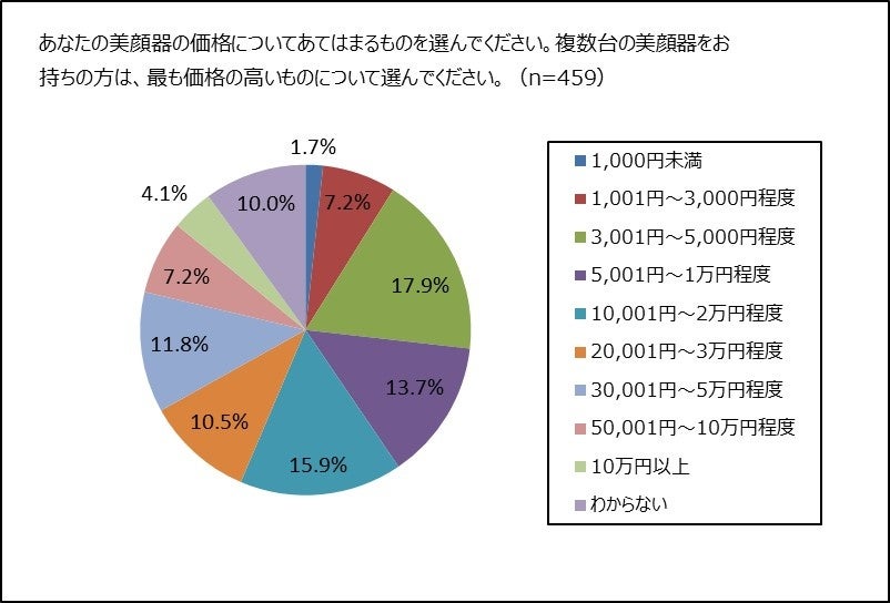 パーソナル美顔器を持っていると答えた459名に持っている美顔器の価格を聞きました。複数の美顔器を持っている場合は、持っている中で最も高いものについて答えてもらいました。所有している価格として最も大きなボリュームゾーンは、3,001円~5,000円程度で17.9%と約2割でした。