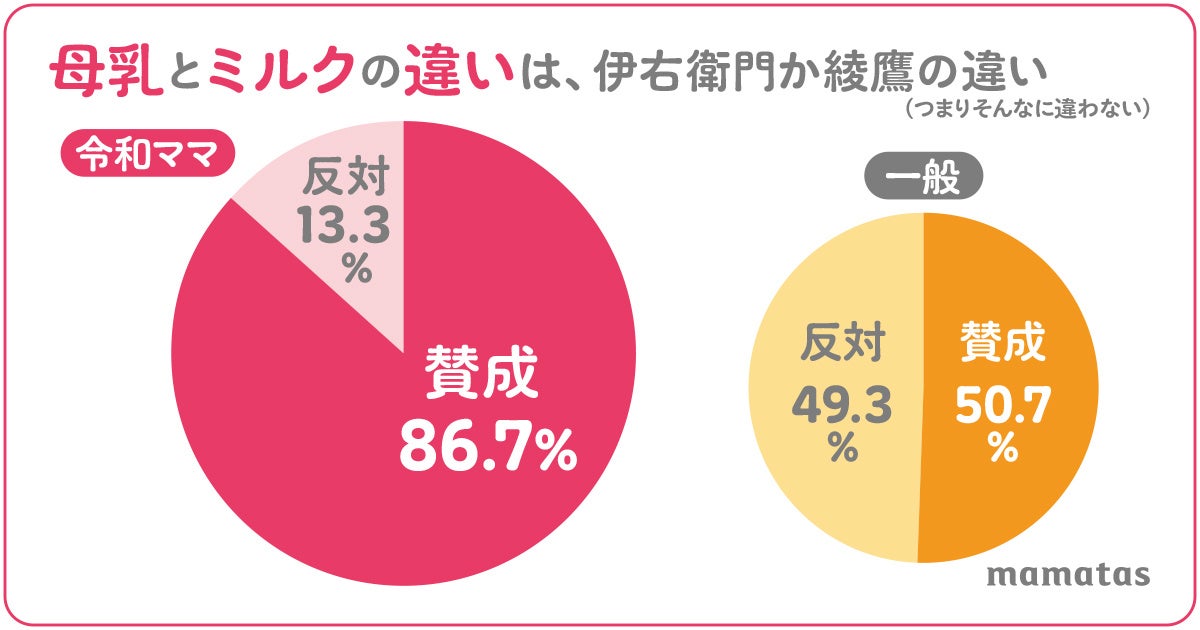 - 「母乳とミルクはほとんど違わない」86.7%と、一般回答(全世代)の賛成50.7%と比べ、令和ママの多くは母乳神話にとらわれていない。