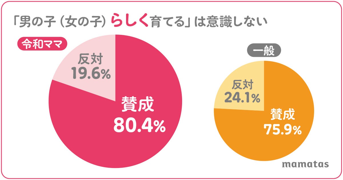 一方、「男の子(女の子)らしく育てるは意識しない」では、9割以上が賛成という高い数字はもちろんのこと、フリー回答でも「子どもの個性を尊重したい」「どちらの性別になってもいいように名付けた」など、令和ママは、昔ながらの偏見には無縁であることがわかります。