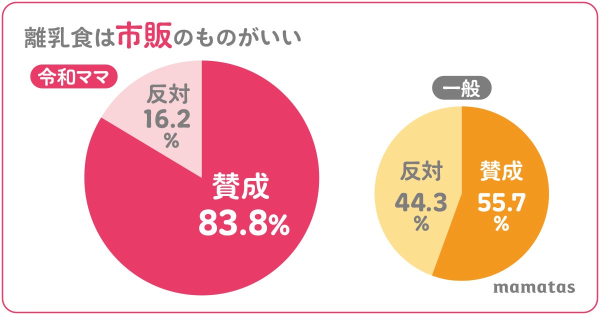 母乳について、一般回答では賛否がほぼ同数と拮抗。一方、令和ママは「子どもが元気に育てはそれでよし!」。「パパも参加できる」「母乳にまつわるストレスが凄すぎる」とむしろミルクにメリットを感じている様子。また令和ママの8割以上は「離乳食は市販のものがいい」。「栄養管理と衛生管理がされている」「レパートリーが多い」と市販の離乳食に高い信頼を寄せている。