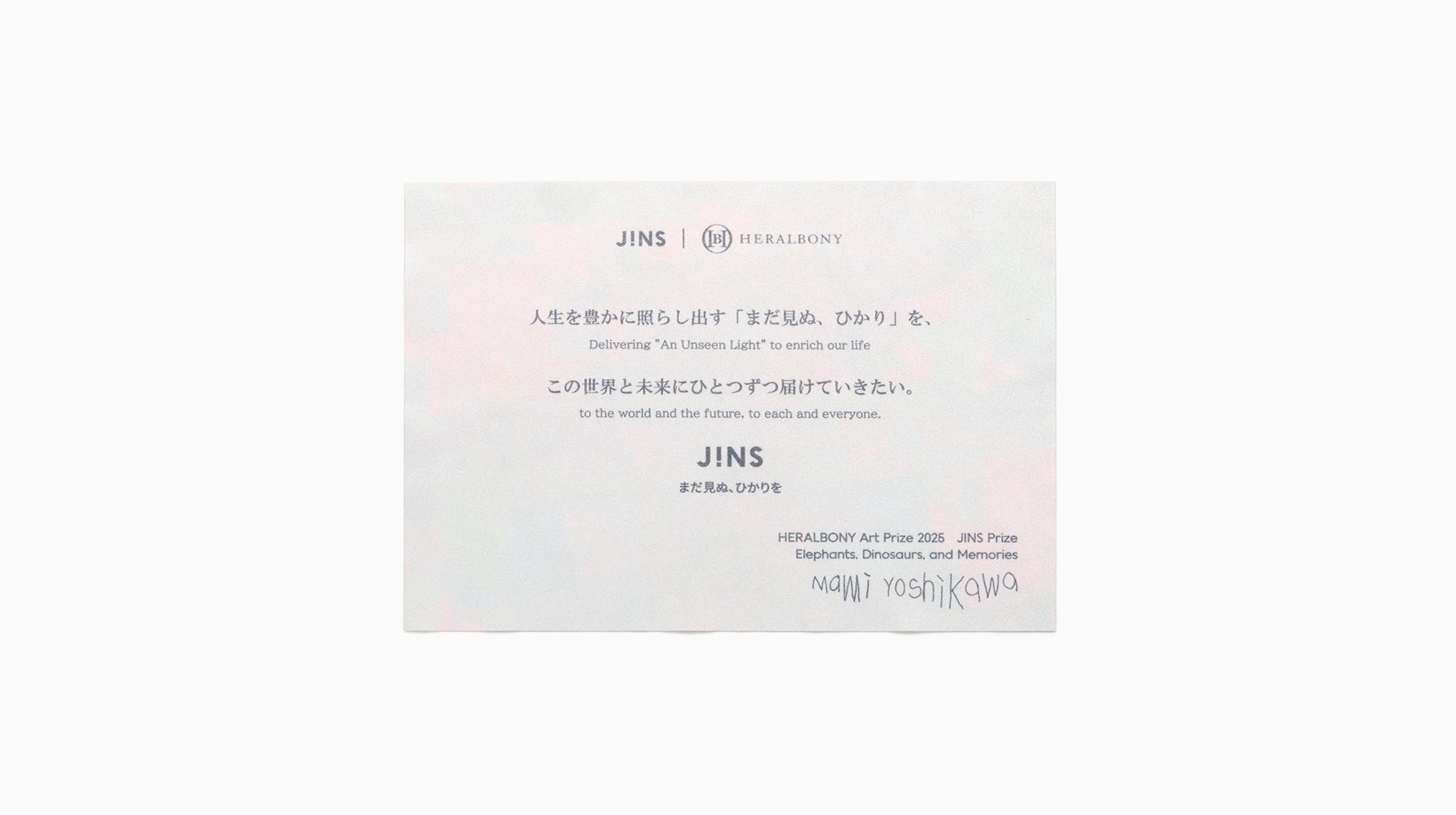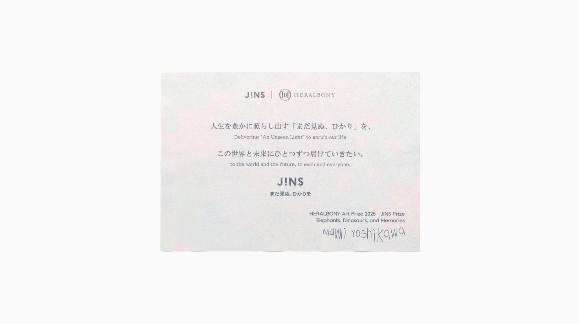 2024年より、障害のあるアーティストの才能を評価し、さらなる活動の機会を生み出す、国際アートアワード「HERALBONY Art Prize」にパートナーとして参画。障害のあるアーティストの可能性を照らすアワードの理念に共感し、第2回目となる2025年はJINS賞に吉川真美氏の作品「ゾウさんと恐竜と思い出たち」を選出しました。