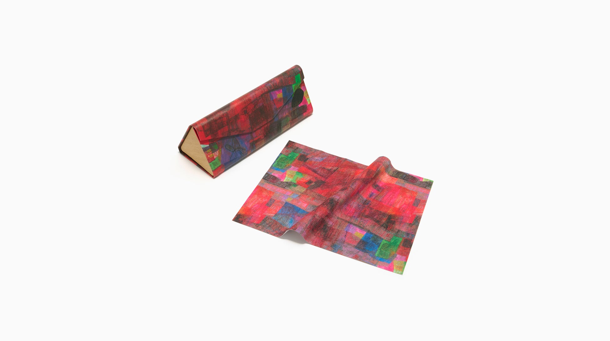 「ゾウさんと恐竜と思い出たち」を纏ったオリジナルのメガネケースとセリートは、作品の魅力を最大限伝えたいという想いから、作品の配置や色の再現性を何度も検証。色彩の美しさを味わい、ふとした時に“こんなモチーフも描かれているんだ”という気づきを楽しんでいただけるように仕上げました。時間の積み重ねによる唯一無二の創作から生まれた作品が、大切なメガネとの日常を彩ります。
