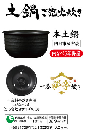 タイガー魔法瓶の土鍋炊飯器には、三重県四日市市の伝統工芸品「四日市萬古焼」を使用しています。土鍋だからこそ実現できる大火力と、土鍋の優しい泡立ちが、口の中に広がるごはんの甘みと旨み、一粒ひと粒の粒立ちの良さを引き出します。一流料亭で供される土鍋ごはんのように上品で、味わい深い理想のごはんを炊きあげる逸品です。