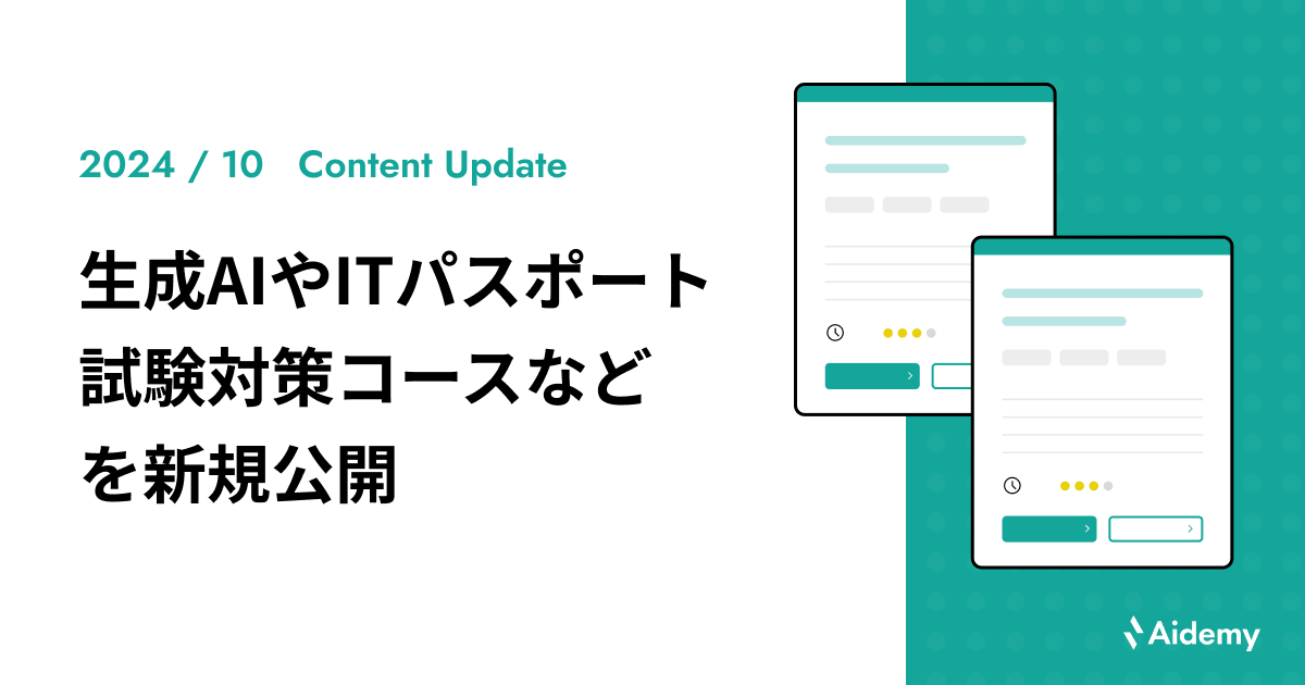2024年10月は、ITに関する基礎知識を証明する国家試験「ITパスポート」の概要や取得のメリットを10分で解説するコースや各出題分野ごとの試験対策コース、またRAGの仕組みとその実践的な活用法を技術者向けに解説した「LLMに外部知識を取り入れる!RAG入門」など、全6コースを新規公開いたしました。