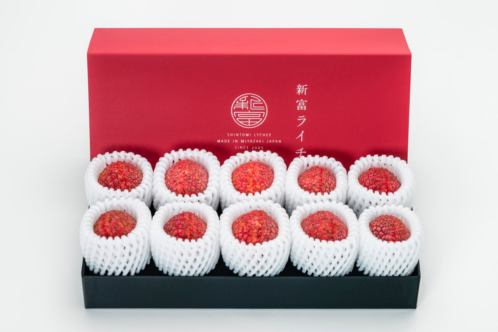 ・新富ライチ レギュラー:1玉40~50g、糖度15度以上(赤箱入り)