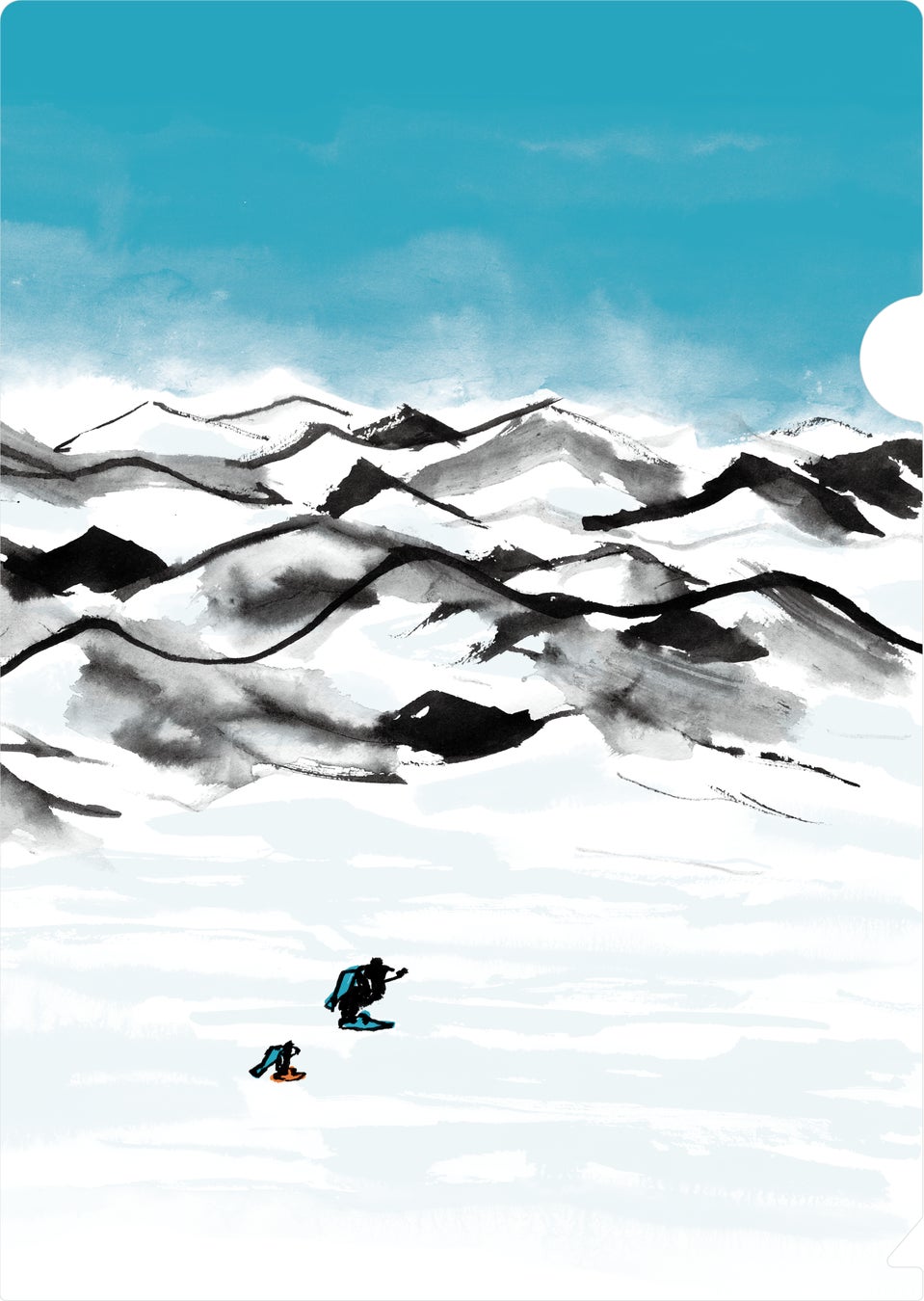 デザインは、北海道函館市出身の佐々木暁さんが担当。発色のよい高級紙を使用し、まるで直接紙に描いたような立体的な色彩と、きくちちきさんの迫力のある筆致を再現しています。ほかにも、雪の存在感を表現するためにニスを塗り重ねたり、お菓子の山親爺の包装紙を模した遊び紙に「紅鮭」という色名の紙を使用するなど、随所にこだわりが見られる「大切にしたい絵本」に仕上げてもらいました。山親爺について解説した別紙「えほん やまおやじのしおり」も見どころです。