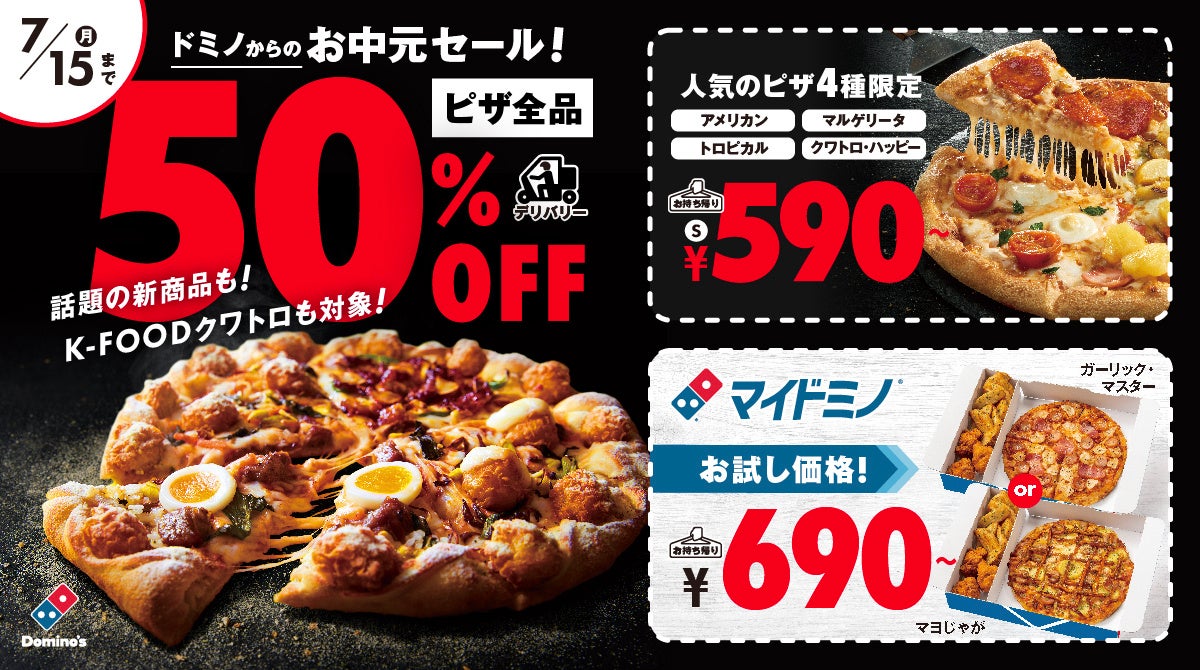 本キャンペーンでは、お中元のシーズンにもぴったりな3つのキャンペーンをご用意しました。①ピザ全品がデリバリー50%OFF、②お持ち帰りではそれぞれ対象のSサイズピザが590円~、③マイドミノ®が690円~、と利用シーン別にクーポンをお選びいただけます。新商品「K-FOODクワトロ」をはじめ、気になるピザやお気に入りのピザで、お世話になった大切な方々に、“ピザでつながる”大切な時間をお贈りください。