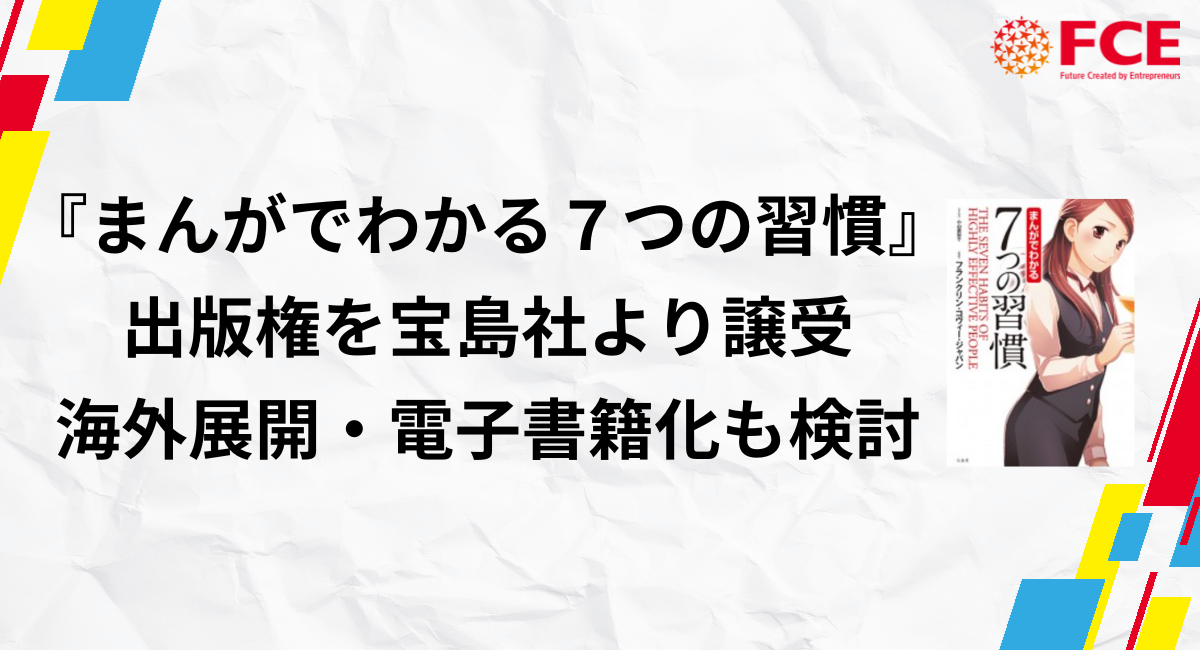 株式会社FCE(本社:東京都新宿区、代表取締役社長:石川淳悦、証券コード9564、以下FCE)は、株式会社宝島社(以下「宝島社」)が保有する『まんがでわかる7つの習慣』シリーズ全5巻の出版権(以下「当該出版権」)の譲受について、同社および著作権者との間で譲渡契約を締結いたしました。