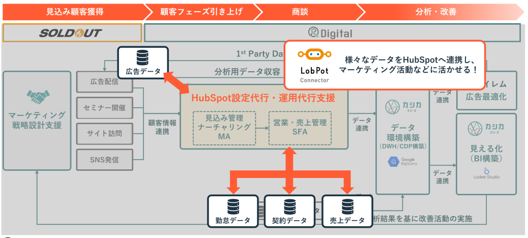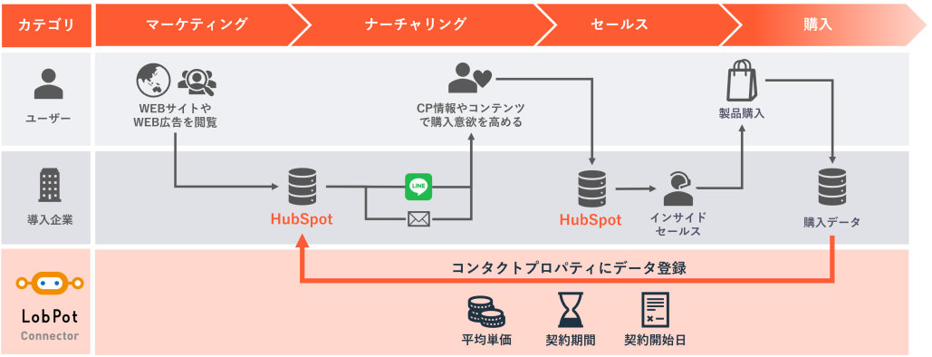 LobPot Connectorを導入することで、HubSpotと外部ツール間のデータ連携を簡単に実行できます。これにより業務プロセスの分断を防ぎ、HubSpotを軸としたビジネスオペレーションの強化と効率化を実現します。