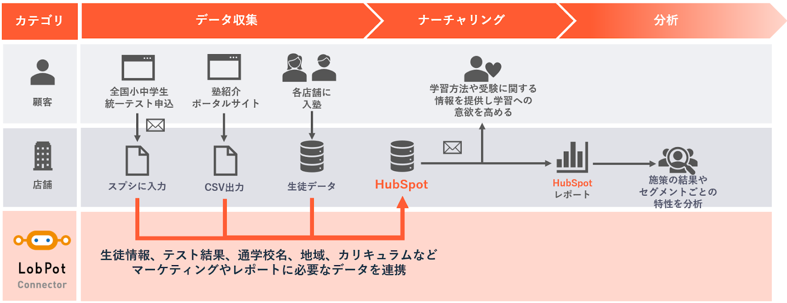 全国模試の申込情報や試験結果、外部ポータルからの問い合わせデータなどのデータ連携を効率化。また、生徒のセグメントデータを活用して高度なナーチャリングやレポーティングも実施。