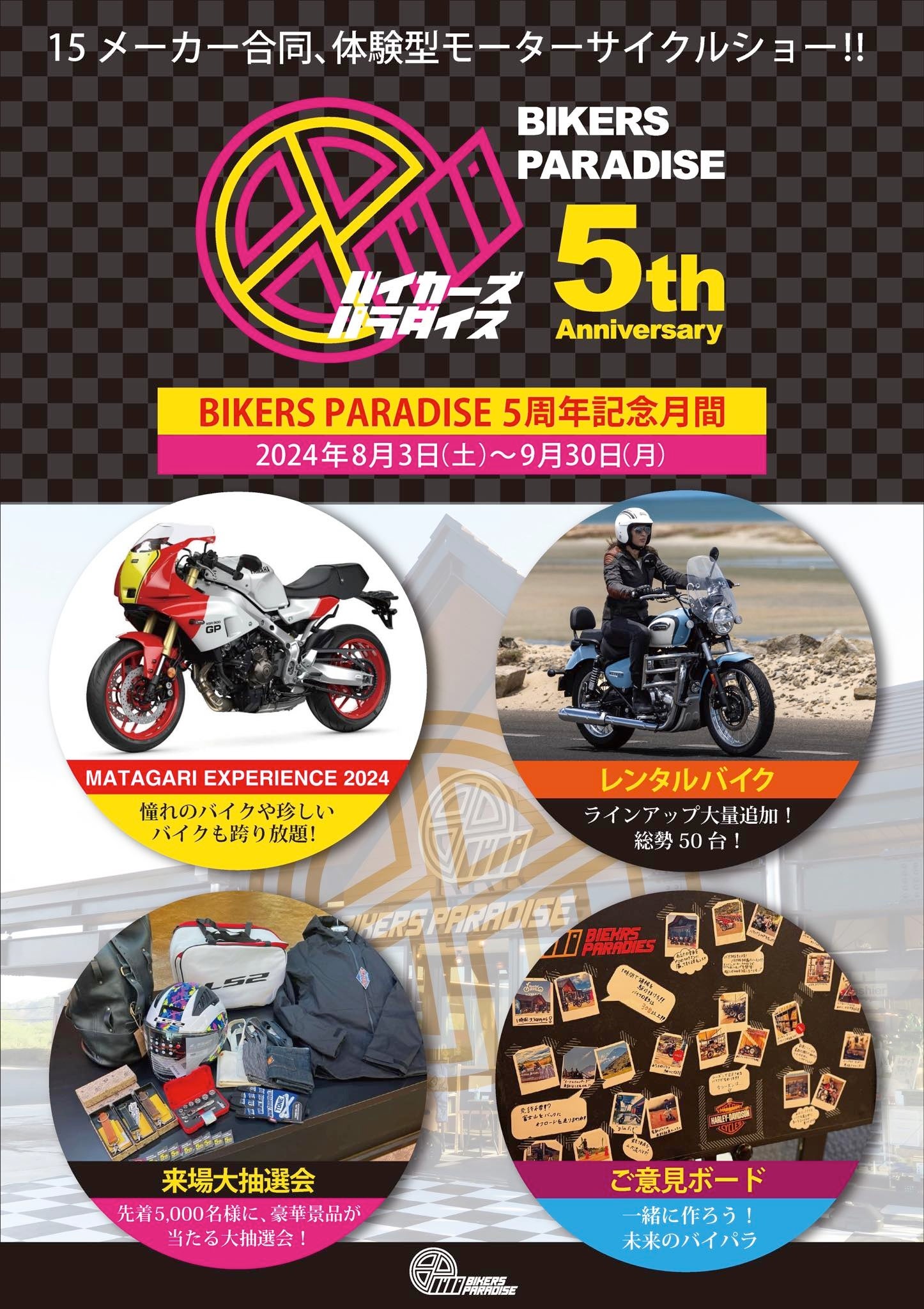 「バイカーズパラダイス南箱根」が、8 月6 日にオープン5 周年を迎えます。それにあわせて8 月3 日から9 月30 日までを5 周年記念月間とし、さまざまなイベントを開催、新たなコンテンツを追加します。