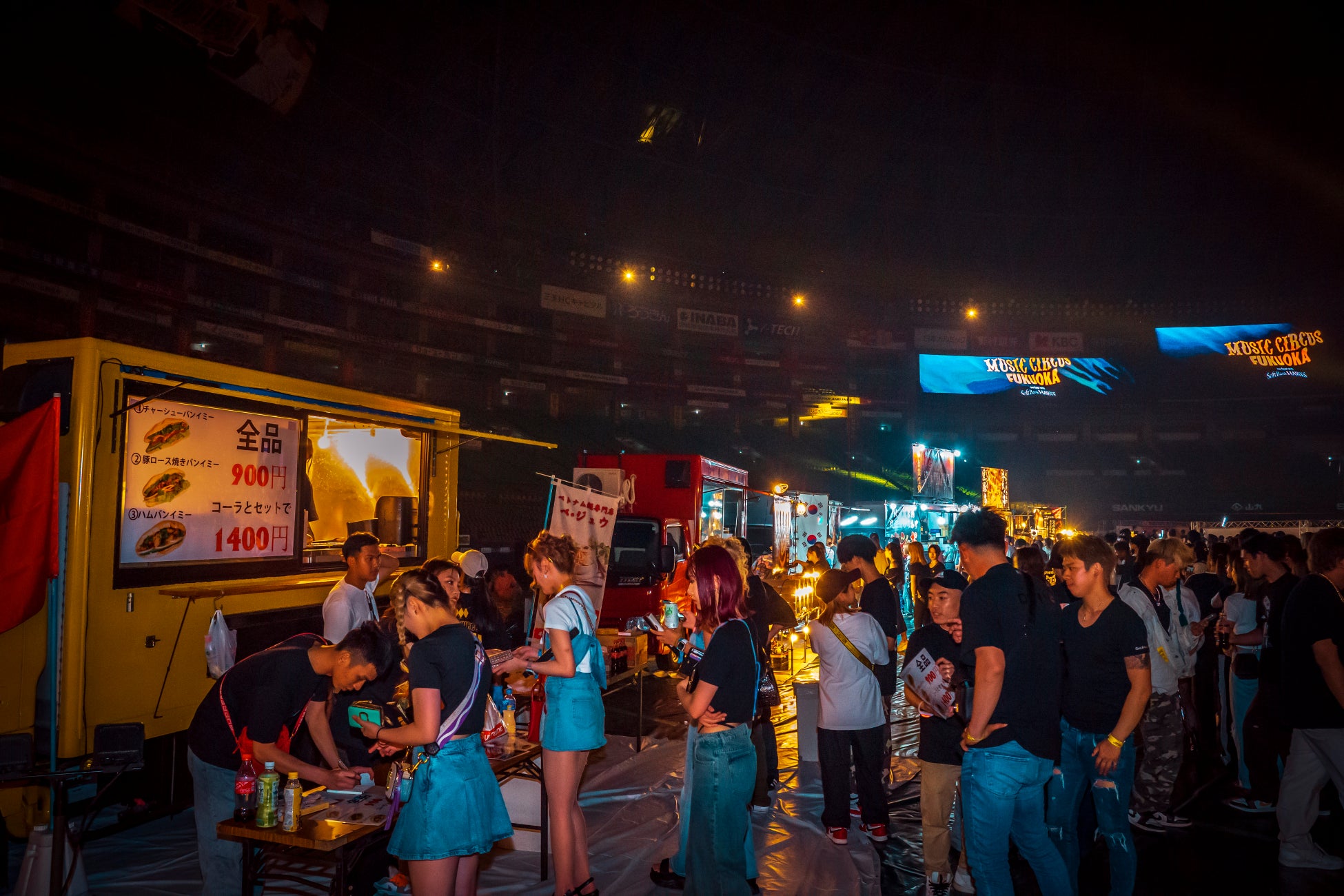 MUSIC CIRCUS FUKUOKAでは、会場内に多数のフードトラックが出店し、バラエティ豊かなグルメメニューを提供します。地元福岡の人気グルメや、全国各地のフェスで話題のキッチンカーが一堂に会し、来場者の五感を刺激します。