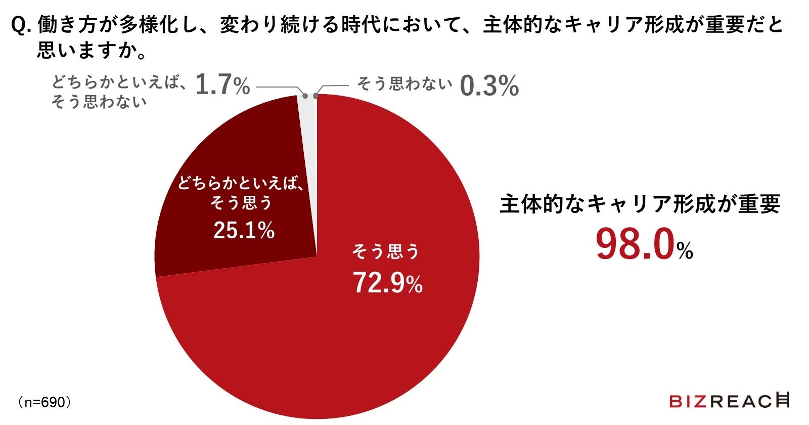 ビズリーチ会員にアンケートを実施したところ、コロナ禍で、7割以上のビジネスパーソンがキャリア観に変化があったと回答しました。また、98.0%のビジネスパーソンが、企業に依存しない「主体的なキャリア形成が重要」と回答し、8割以上のビジネスパーソンが転職に意欲的であることが分かりました。