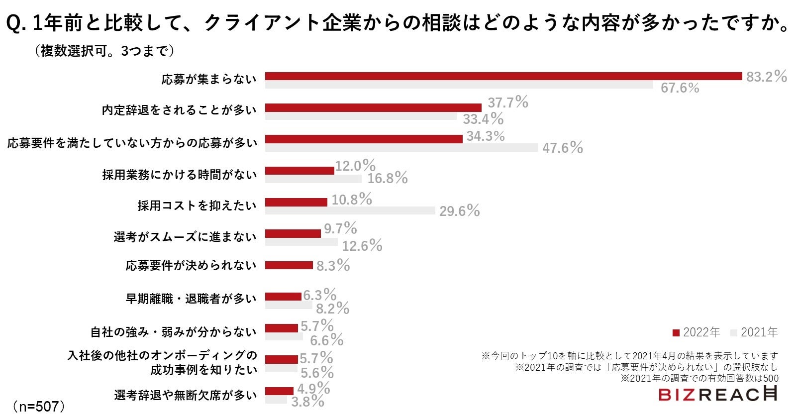 1年前と比較して増加した、クライアント企業からの相談内容について質問したところ、「応募が集まらない(83.2%)」という回答が最も多い結果となりました。昨年と比べると、15.6ポイント増加しており、慢性的な人材不足がより深刻化していることがうかがえます。