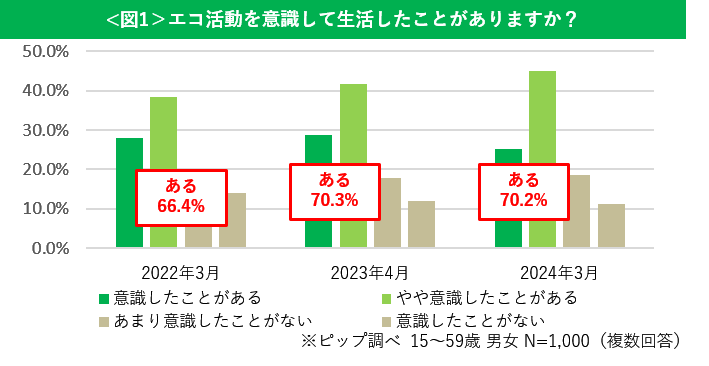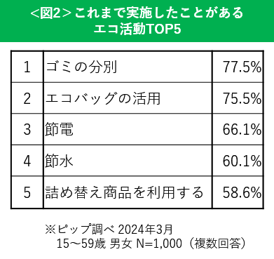 現在、多くの生活者が環境配慮への意識を持ち様々な取り組みを行っていますが、その取り組みは多岐に渡ります。ピップでは定期的にエコ活動について調査を行っており、2023年以降では7割が、「エコ活動を意識して生活したことがある」と回答し、エコ活動への意識がきちんと浸透していることが伺えます<図1>。また、これまで実施したことがあるエコ活動としては、「ゴミの分別(77.5%)」が最も多く、次いで「エコバッグの活用(75.5%)」が多い結果となりました<図2>。その他にも「節電(66.1%)」 「節水(60.1%)」「詰め替え商品を利用する(58.6%)」が続き、生活の中で意識しやすく、すぐに実践できるエコ活動が中心であるという結果となりました。