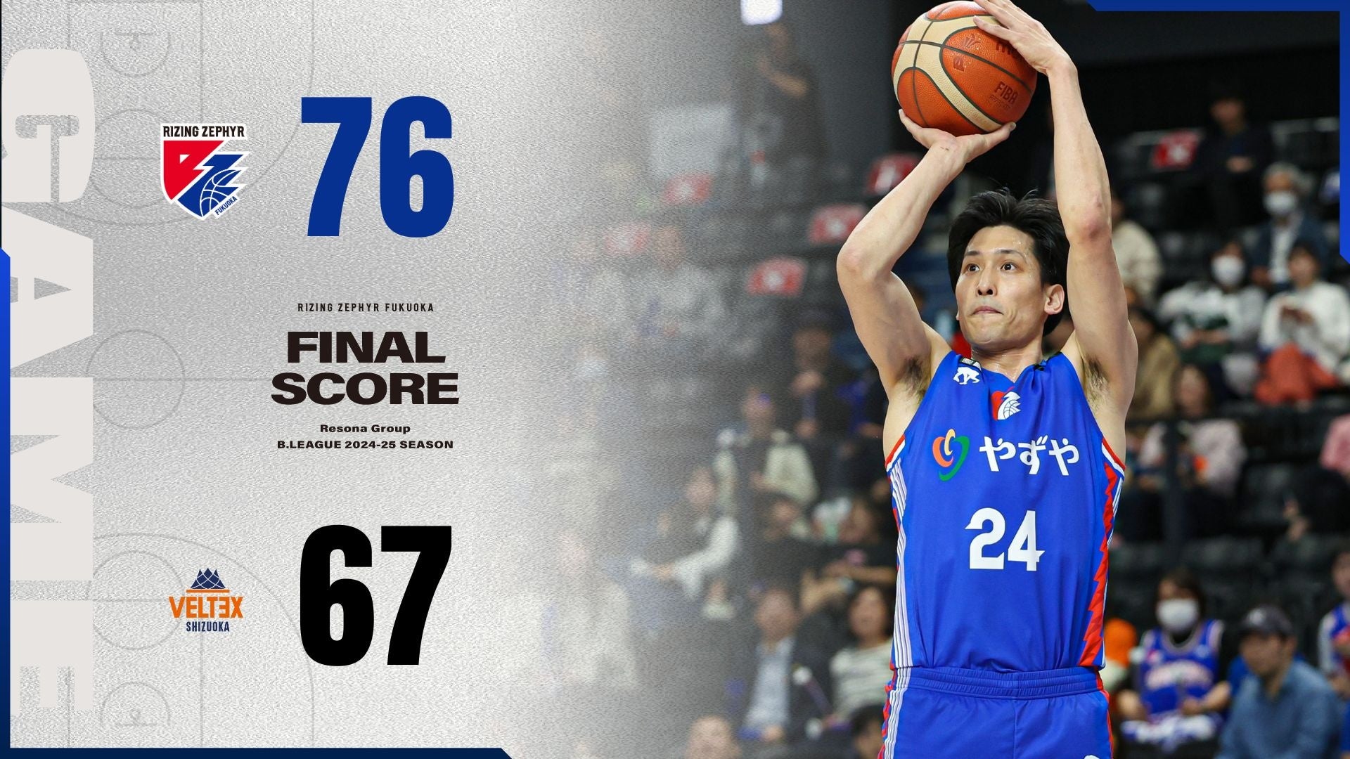 2025年4月11日(金)に開催した、りそなグループ B.LEAGUE 2024-25 シーズン【ライジングゼファーフクオカ vs.ベルテックス静岡】は、“福岡76-67静岡”で福岡の勝利となりました。