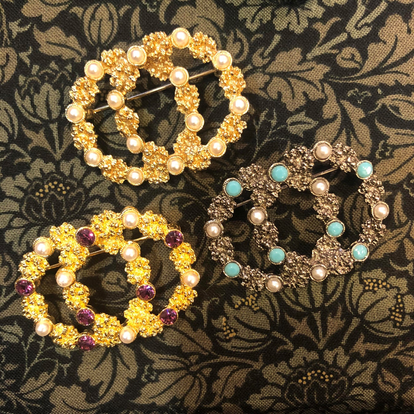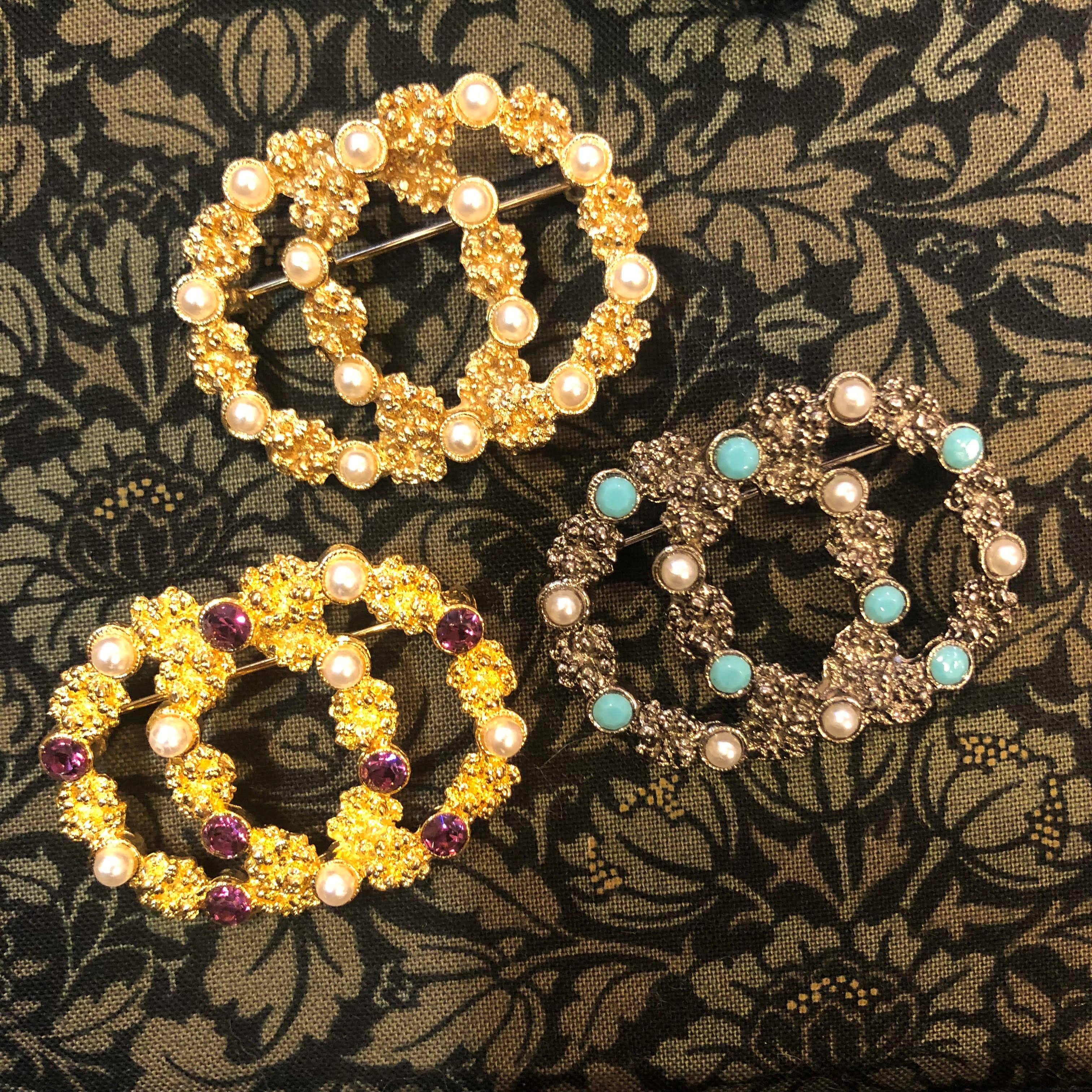 ●『クリーシェ』ビンテージブローチ (亜鉛合金・ラインストーン・イミテーションパール/ W4.3×H3cm) 各4,400 円