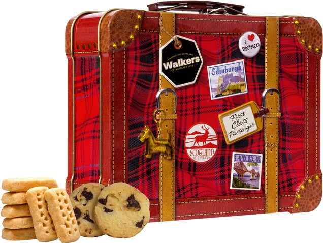 ユニークなスーツケース型の缶に、フィンガー、チョコチップの2種類のショートブレッドが入っています。