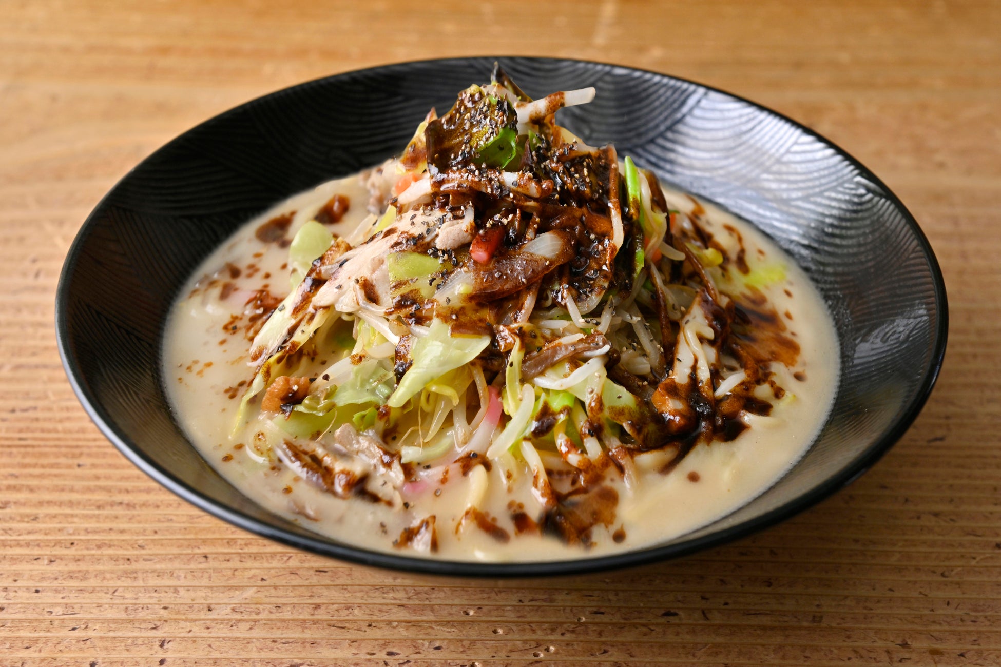 焦がしにんにくの黒マー油と粗挽き黒胡椒でパンチを効かせたラーメン。