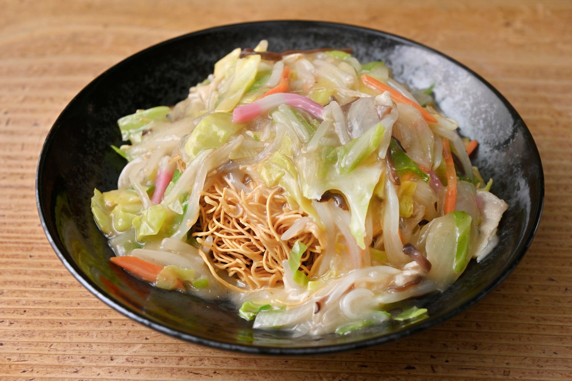 パリパリ麺に純白鶏豚骨スープの熱々野菜あんかけ。他、辛味噌の「赤皿うどん」、焦がしにんにくの「黒皿うどん」もご用意。