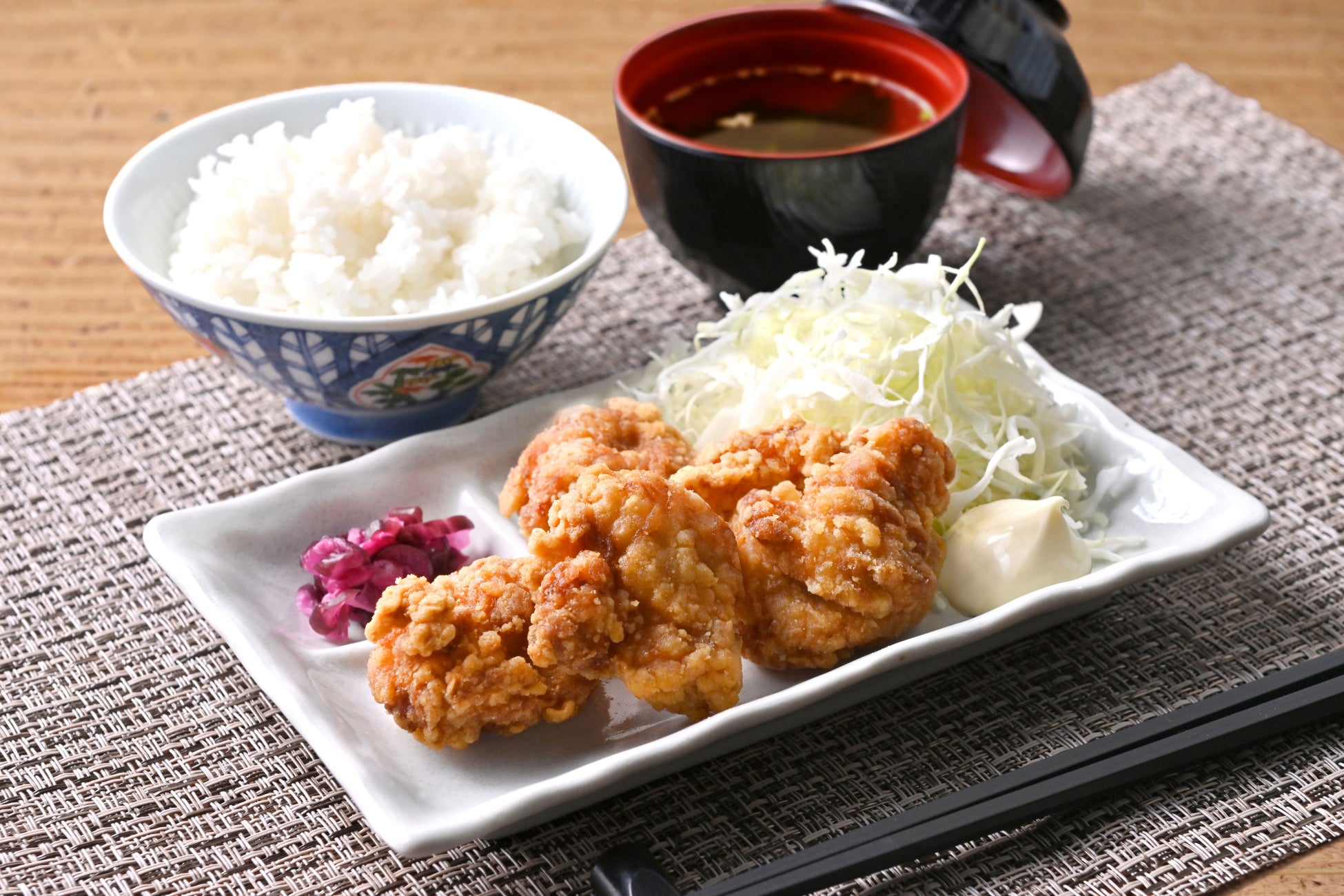 カラッとジューシーな本格和風からあげの定食。ごはん、スープ、味玉つき。