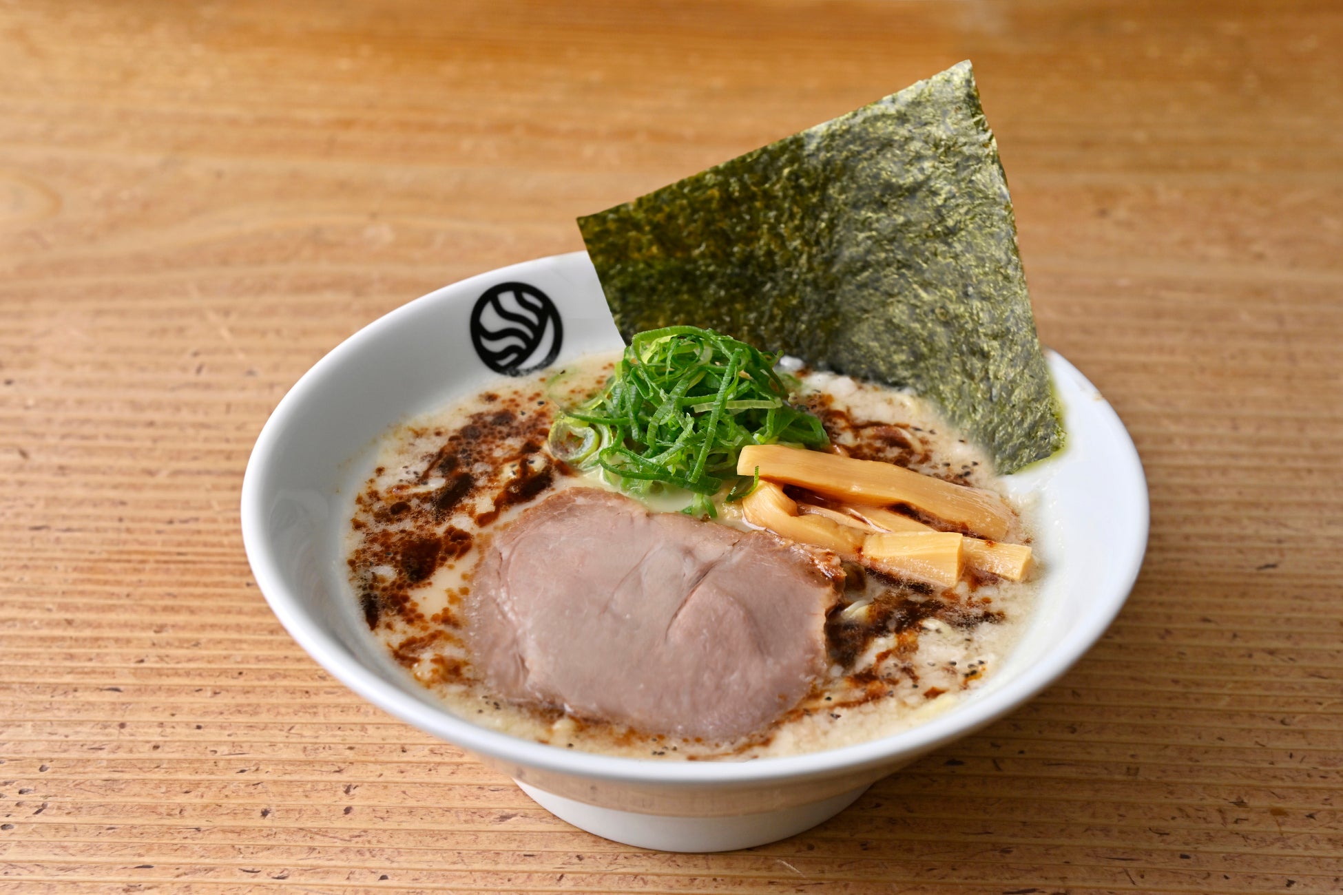 鶏×豚骨のWスープに魚介の旨味たっぷりの特製かえしでコクを加えた絶品スープ。香り華やぐ削りかまぼこが彩る看板商品。