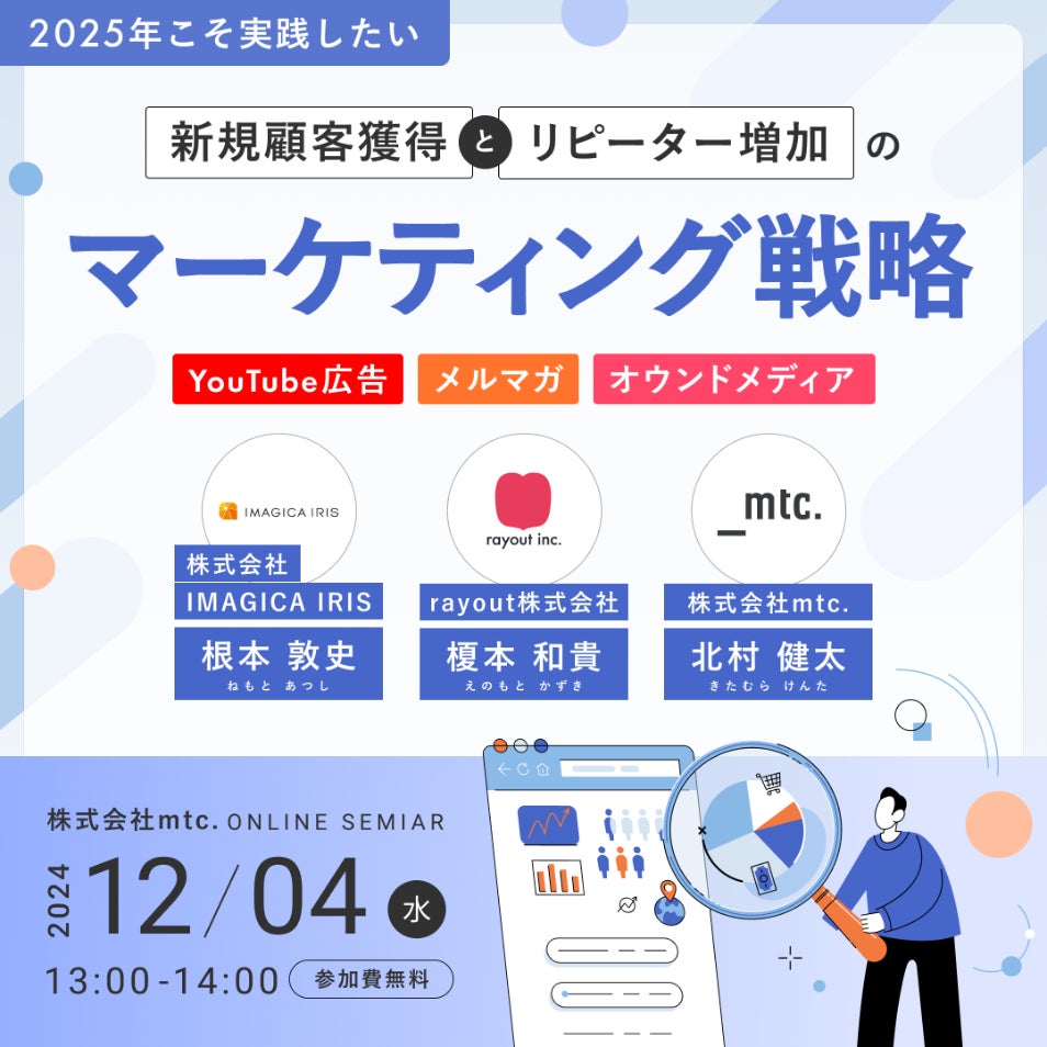 そこで、今回のセミナーでは、【新規顧客獲得とリピーター増加のマーケティング戦略】をテーマに、オウンドメディア運用を支援するrayout株式会社 榎本氏、CRMのスペシャリスト集団株式会社mtc. 北村氏、YouTube広告支援を提供する株式会社IMAGICA IRIS 根本の3名が、2025年に採用したいマーケティング戦略のヒントをお届けします。