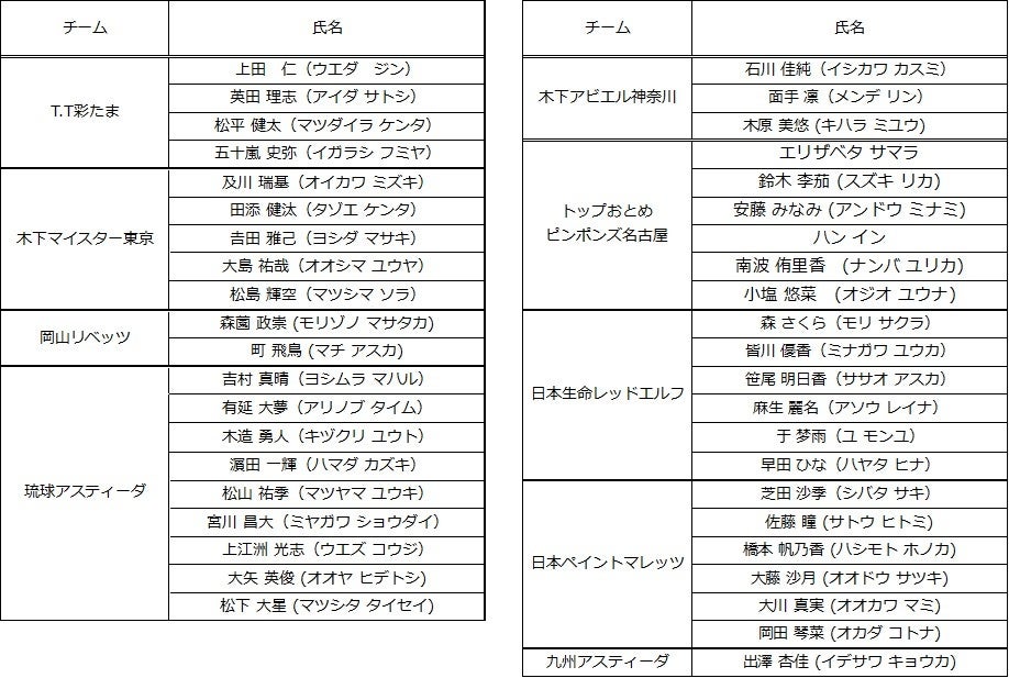 卓球のTリーグ 2022-2023シーズン 登録完了選手(2022年4月28日付)