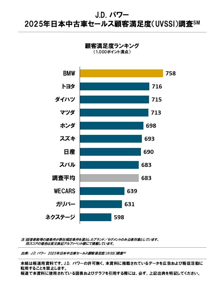 CS(顧客満足度)に関する調査・コンサルティングの国際的な専門機関である株式会社J.D. パワー ジャパン(本社:東京都港区、CEO:木本卓、略称:J.D. パワー)は、2025年日本中古車セールス顧客満足度(Japan Used Vehicle Sales Satisfaction Index、略称UVSSI)調査の結果を発表した。