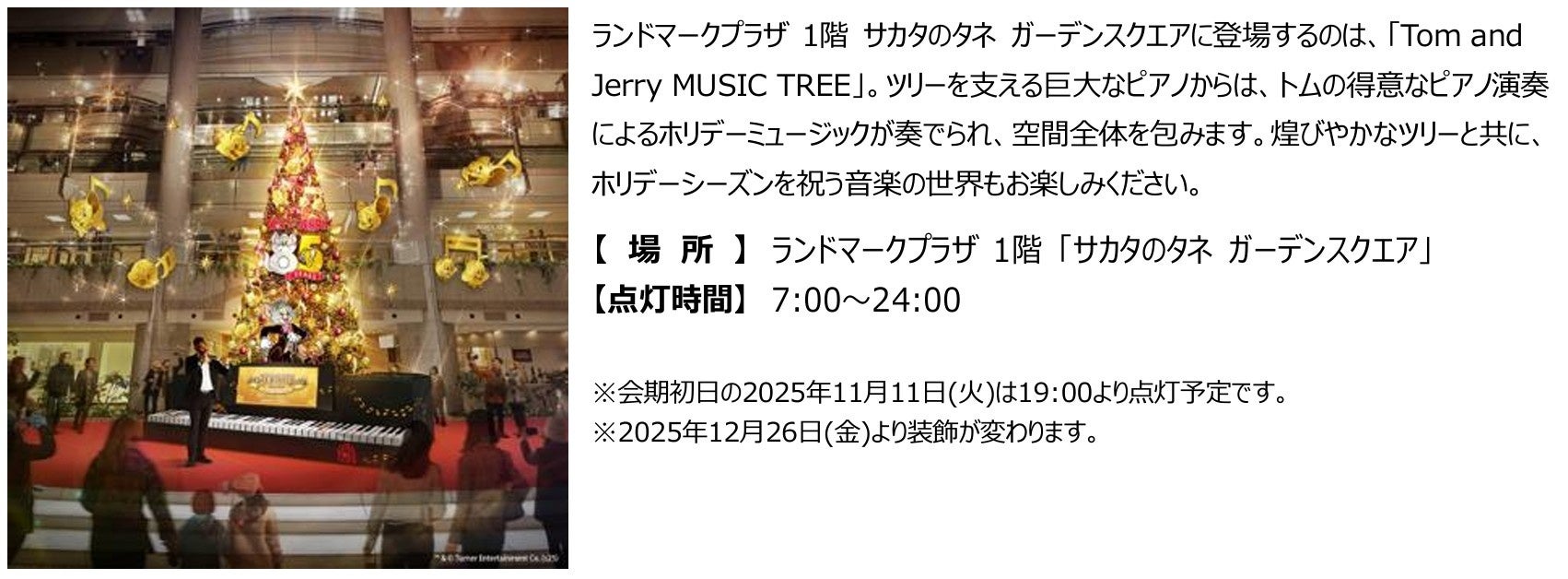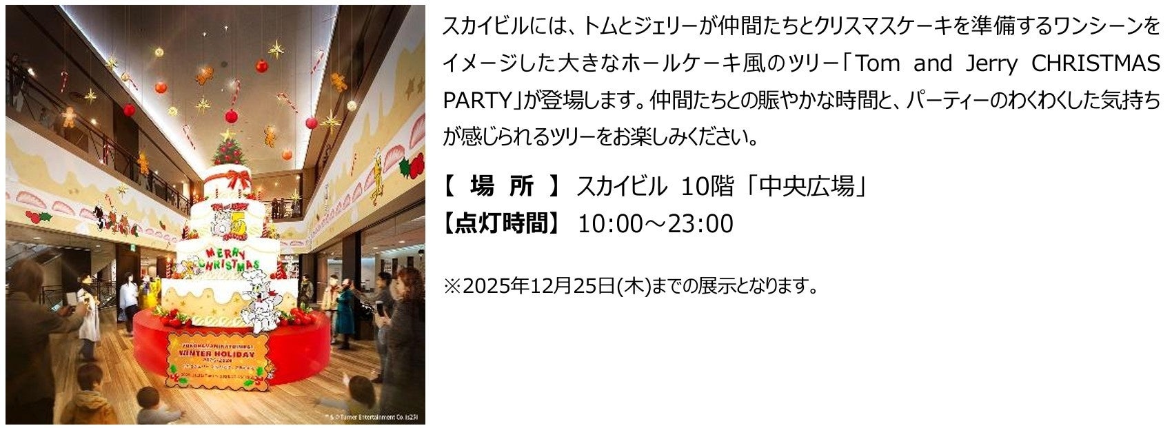 横浜ランドマークタワー(ランドマークプラザ・69階展望フロア スカイガーデン)<神奈川県横浜市/運営:三菱地所プロパティマネジメント株式会社>、MARK IS みなとみらい<同/運営:同>、スカイビル<同/運営:株式会社横浜スカイビル>の3施設は、ワーナーブラザース・ディスカバリー グローバル・コンシューマープロダクツとのパートナーシップのもと、2025年11月11日(火)~2026年1月12日(月・祝)の期間中、今年85周年を迎えた「トムとジェリー」とともに、クリスマスからニューイヤーシーズンを盛り上げるホリデーイベント「YOKOHAMA MINATOMIRAI WINTER HOLIDAY 2025-2026 -トムとジェリー となりには、キミがいる。-」を開催します。