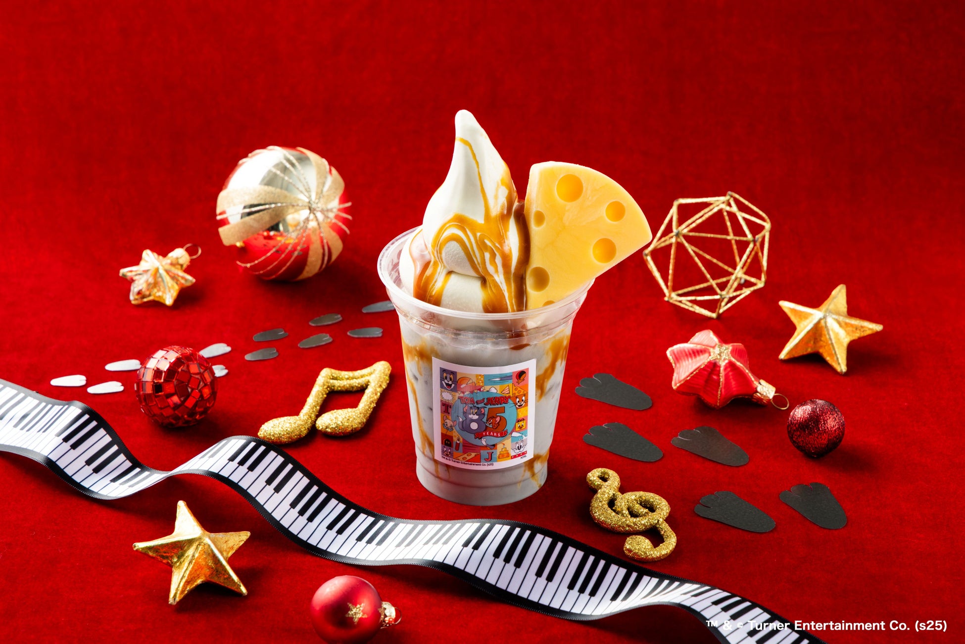 トムのカラーをイメージした黒ゴマ風味のラテにジェリーのカラーをイメージしたキャラメルや大好物のチーズを模したカスタードプリンアイスをトッピングした贅沢なバニラフロート。