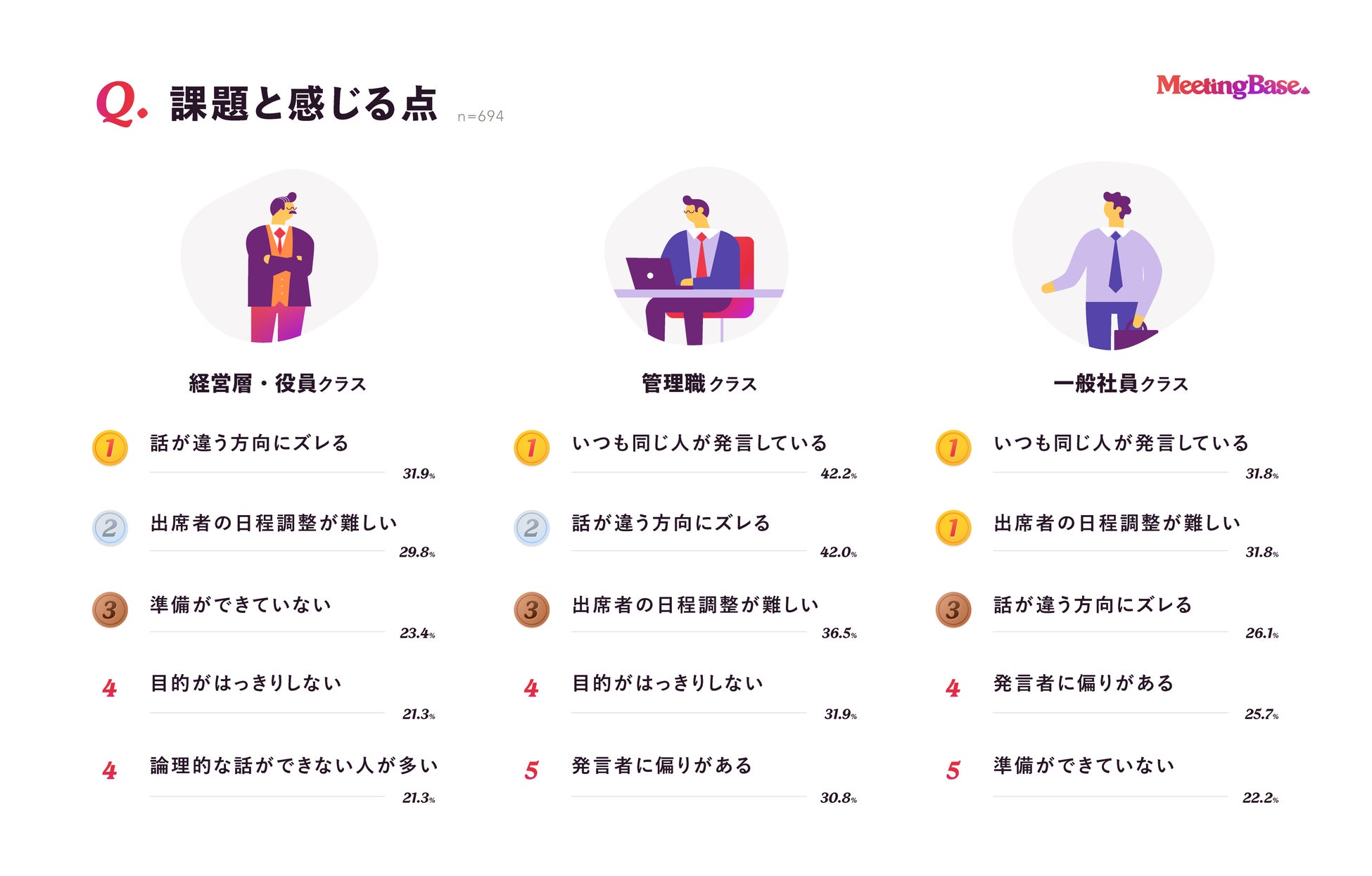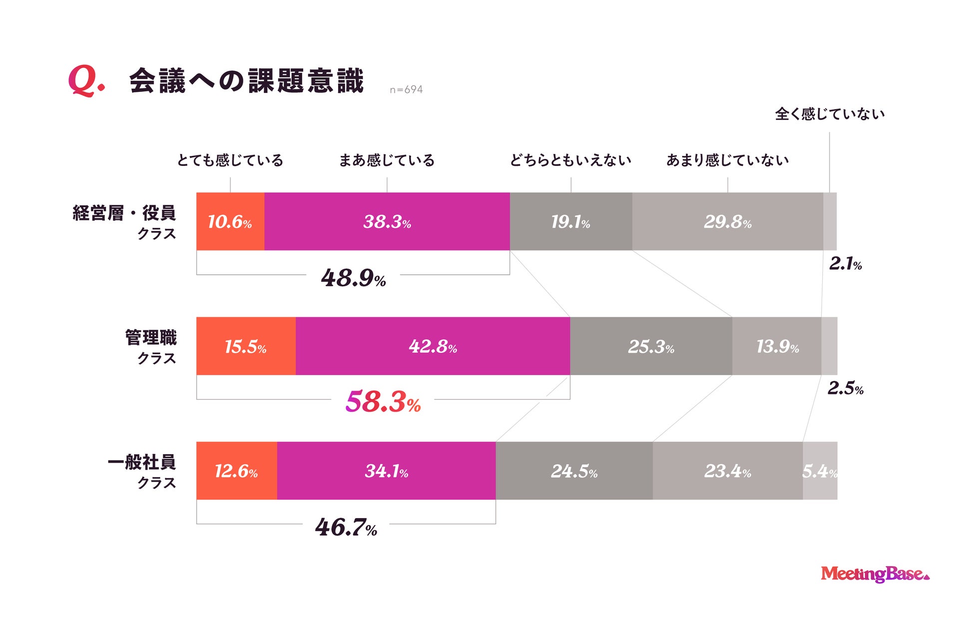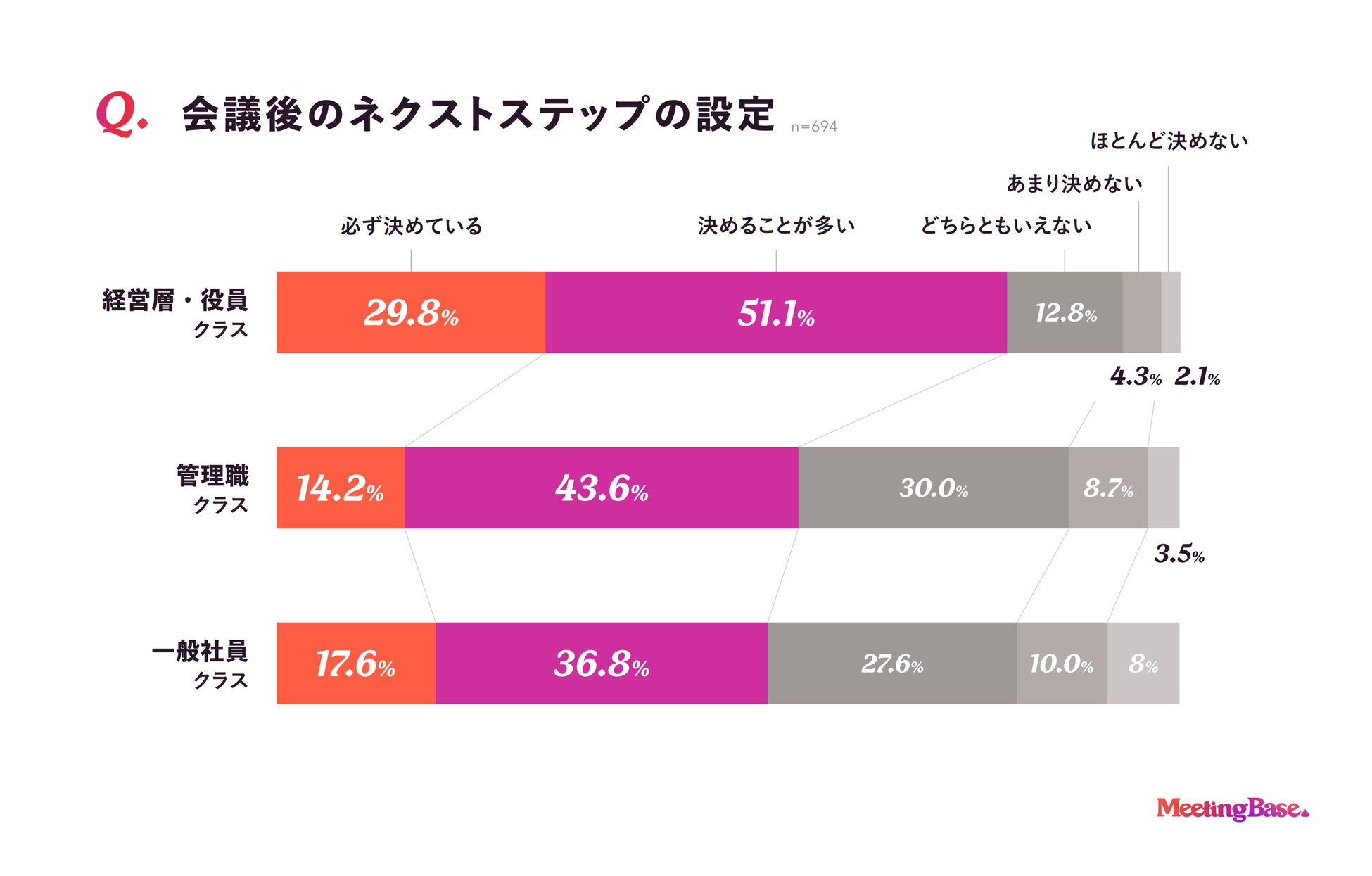 この調査結果から、経営層・役員クラスでは、会議への参加意識が高く、ネクストステップを決める傾向が強いことが明らかになりました。その一方で、管理職や一般社員クラスでは、会議の時間超過や課題感(同じ人が発言するという課題など)による意識の低下などが見受けられました。