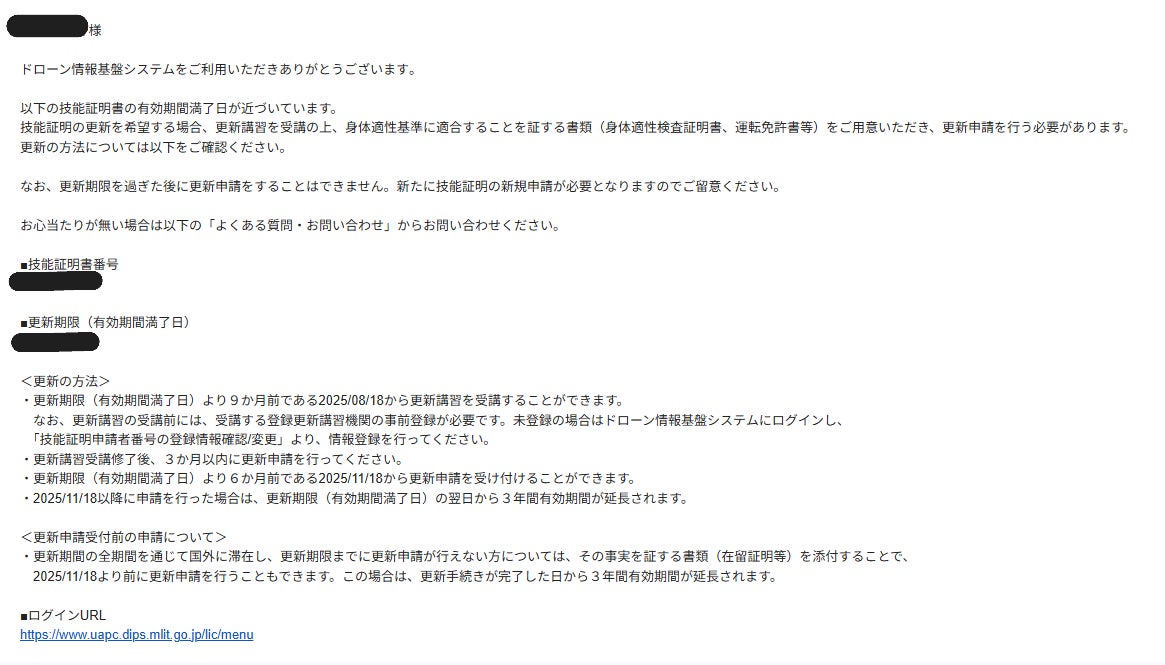 更新を迎える方には、国土交通省から【ドローン情報基盤システム 更新期限のお知らせ 更新講習受講のご案内】という件名のメールが届いています。こちらのメールを画面保存し、お申込の際に提出していただきます。