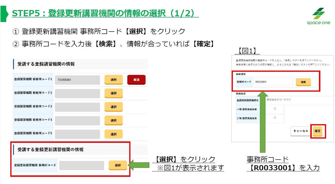 受講したいスクールの「事務所コード」を選択していただきます。全部で7つのステップとなっており、弊社では手順をわかりやすくまとめたマニュアルを見ながら進めることが出来ます。