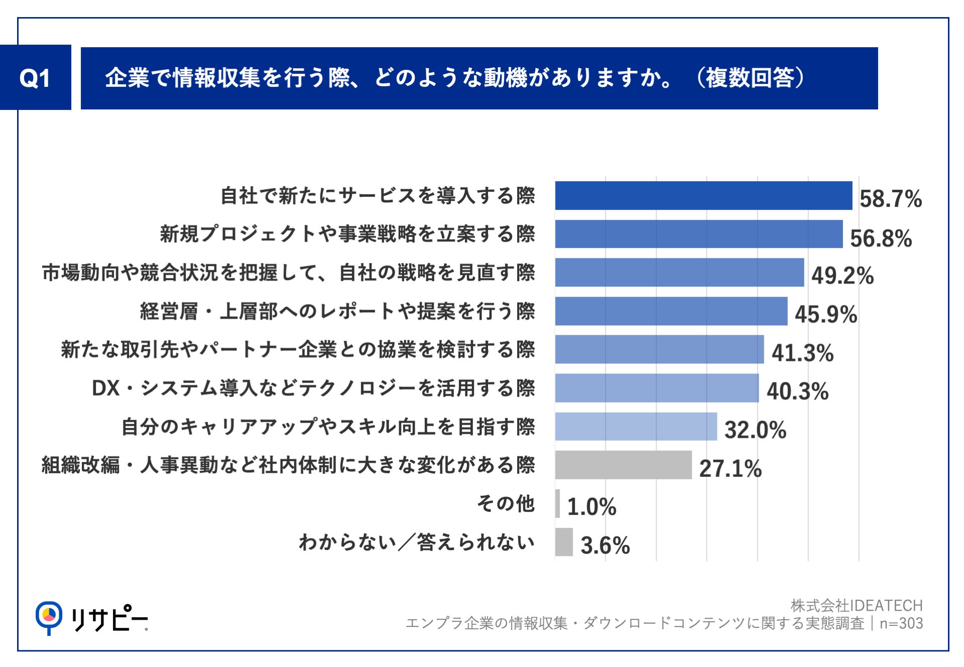 「Q1.企業で情報収集を行う際、どのような動機がありますか。(複数回答)」(n=303)と質問したところ、「自社で新たにサービスを導入する際」が58.7%、「新規プロジェクトや事業戦略を立案する際」が56.8%という回答となりました。