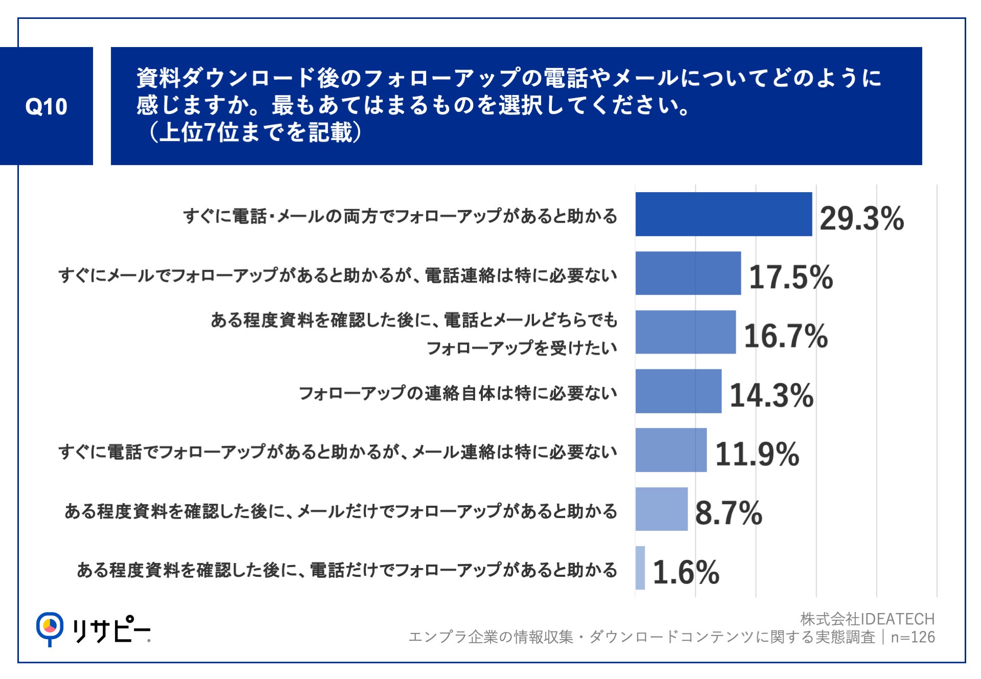 Q9で「非常にそう思う」「ややそう思う」と回答した方に、「Q10.資料ダウンロード後のフォローアップの電話やメールについてどのように感じますか。最もあてはまるものを選択してください。」(n=126)と質問したところ、「すぐに電話・メールの両方でフォローアップがあると助かる」が29.3%、「すぐにメールでフォローアップがあると助かるが、電話連絡は特に必要ない」が17.5%という回答となりました。