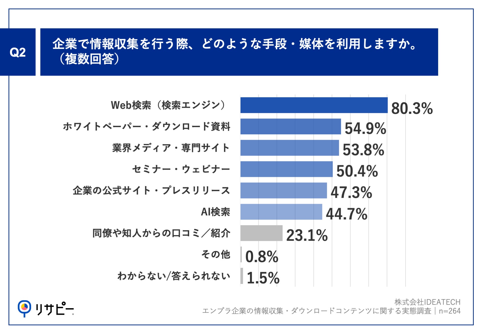 Q1で「自社で新たにサービスを導入する際」「新規プロジェクトや事業戦略を立案する際」「市場動向や競合状況を把握して、自社の戦略を見直す際」「経営層・上層部へのレポートや提案を行う際」と回答した方に、「Q2.企業で情報収集を行う際、どのような手段・媒体を利用しますか。(複数回答)」(n=264)と質問したところ、「Web検索(検索エンジン)」が80.3%、「ホワイトペーパー・ダウンロード資料」が54.9%、「業界メディア・専門サイト」が53.8%という回答となりました。