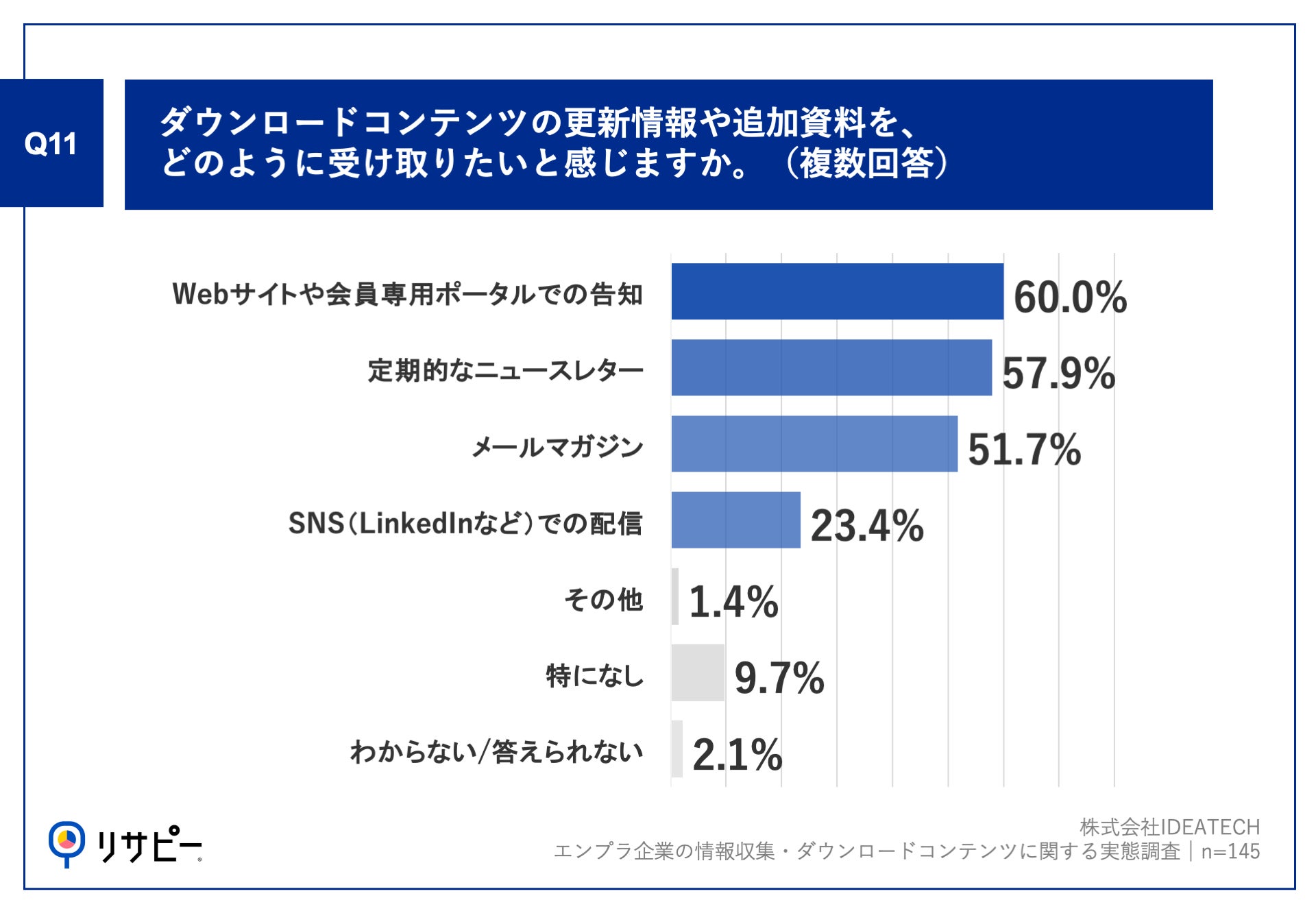 Q2で「ホワイトペーパー・ダウンロード資料」と回答した方に、「Q11.ダウンロードコンテンツの更新情報や追加資料を、どのように受け取りたいと感じますか。(複数回答)」(n=145)と質問したところ、「Webサイトや会員専用ポータルでの告知」が60.0%「定期的なニュースレター」が57.9%、「メールマガジン」が51.7%という回答となりました。