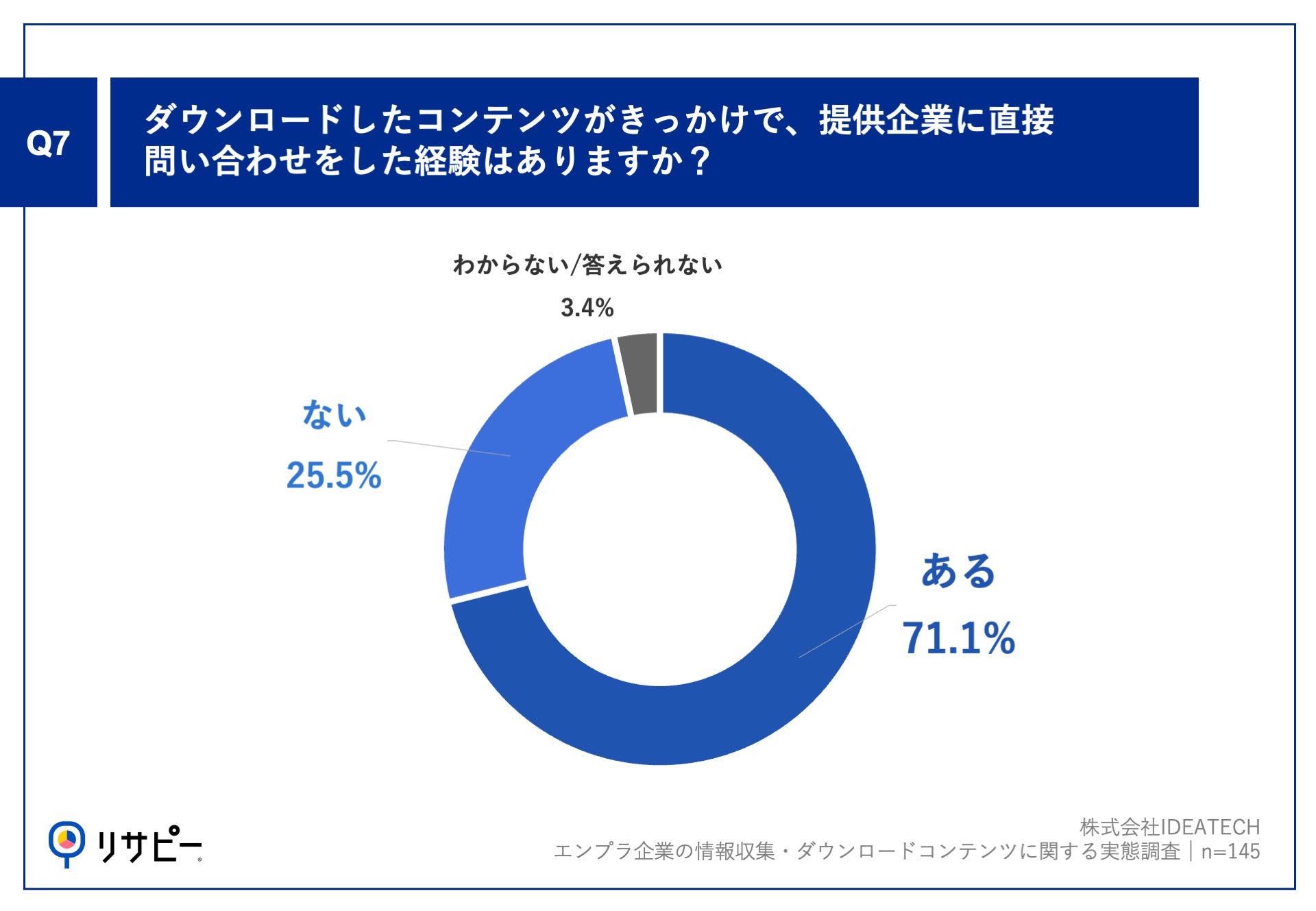 Q2で「ホワイトペーパー・ダウンロード資料」と回答した方に、「Q7.ダウンロードしたコンテンツがきっかけで、提供企業に直接問い合わせをした経験はありますか?」(n=145)と質問したところ、「ある」が71.1%、「ない」が25.5%という回答となりました。