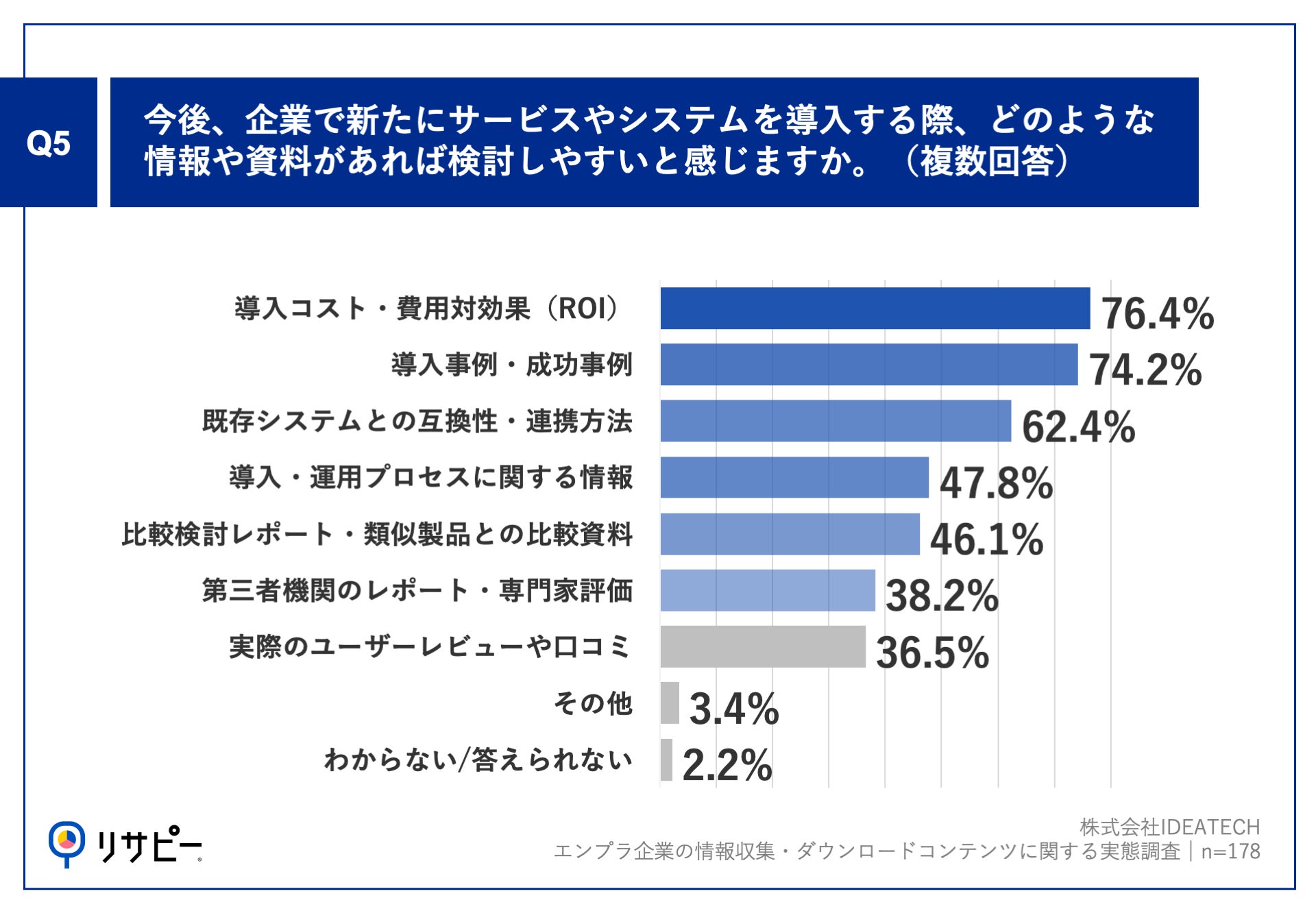 Q1で「自社で新たにサービスを導入する際」と回答した方に、「Q5.今後、企業で新たにサービスやシステムを導入する際、どのような情報や資料があれば検討しやすいと感じますか。(複数回答)」(n=178)と質問したところ、「導入コスト・費用対効果(ROI)」が76.4%、「導入事例・成功事例」が74.2%、「既存システムとの互換性・連携方法」が62.4%という回答となりました。