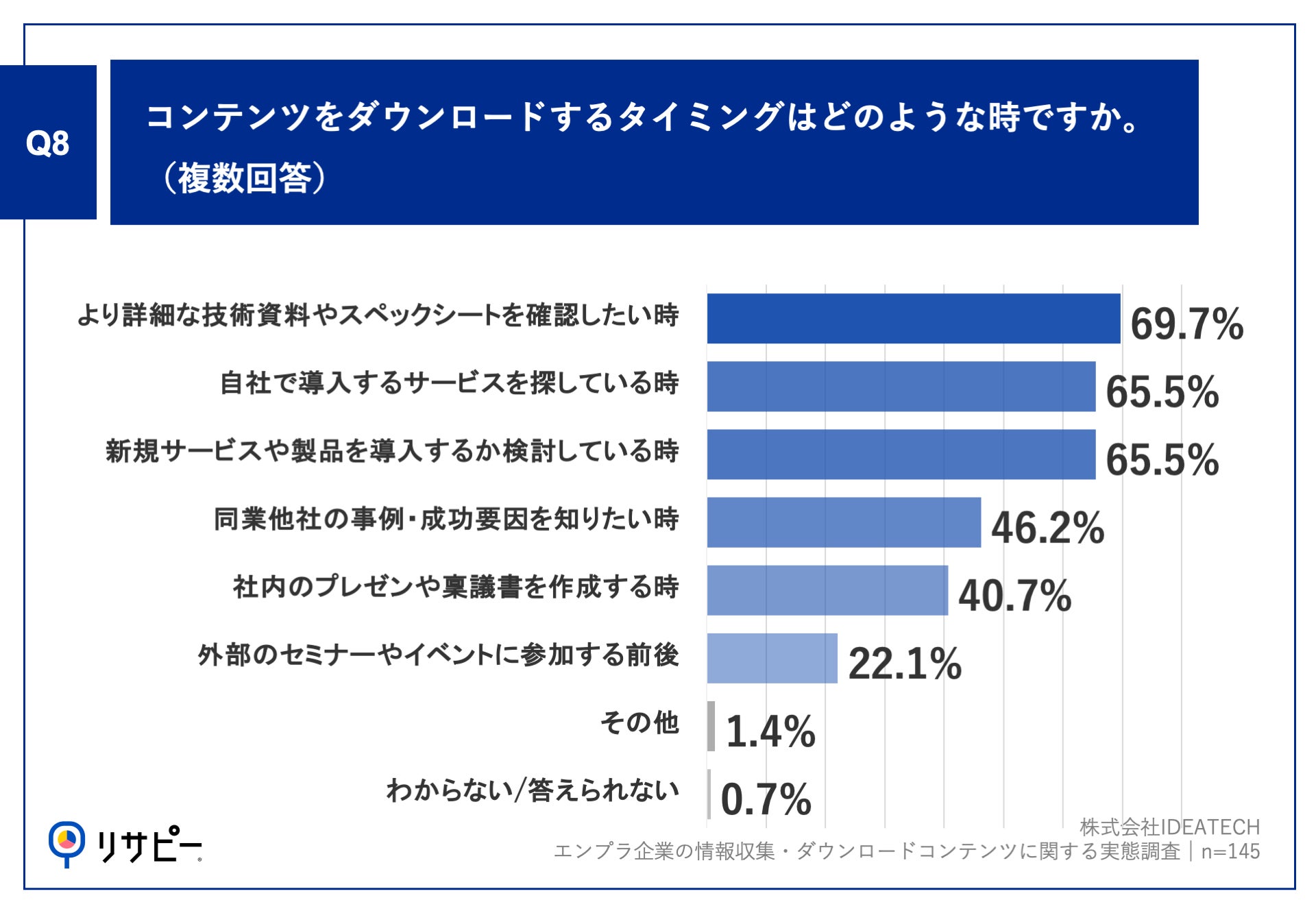 Q2で「ホワイトペーパー・ダウンロード資料」と回答した方に、「Q8.コンテンツをダウンロードするタイミングはどのような時ですか。(複数回答)」(n=145)と質問したところ、「より詳細な技術資料やスペックシートを確認したい時」が69.7%、「自社で導入するサービスを探している時」が65.5%、「新規サービスや製品を導入するか検討している時」が65.5%という回答となりました。