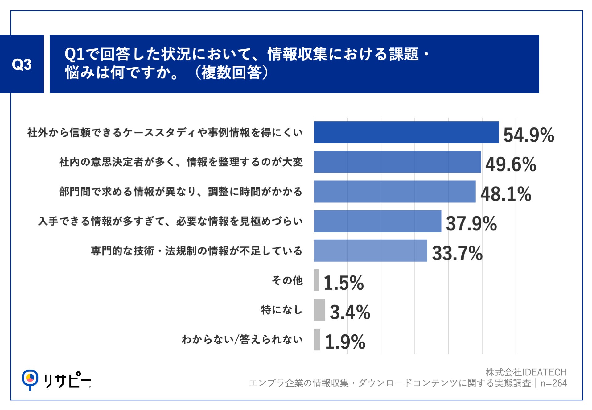 Q1で「自社で新たにサービスを導入する際」「新規プロジェクトや事業戦略を立案する際」「市場動向や競合状況を把握して、自社の戦略を見直す際」「経営層・上層部へのレポートや提案を行う際」と回答した方に「Q3.Q1で回答した状況において、情報収集における課題・悩みは何ですか。(複数回答)」(n=264)と質問したところ、「社外から信頼できるケーススタディや事例情報を得にくい」が54.9%、「社内の意思決定者が多く、情報を整理するのが大変」が49.6%、「部門間で求める情報が異なり、調整に時間がかかる」が48.1%という回答となりました。