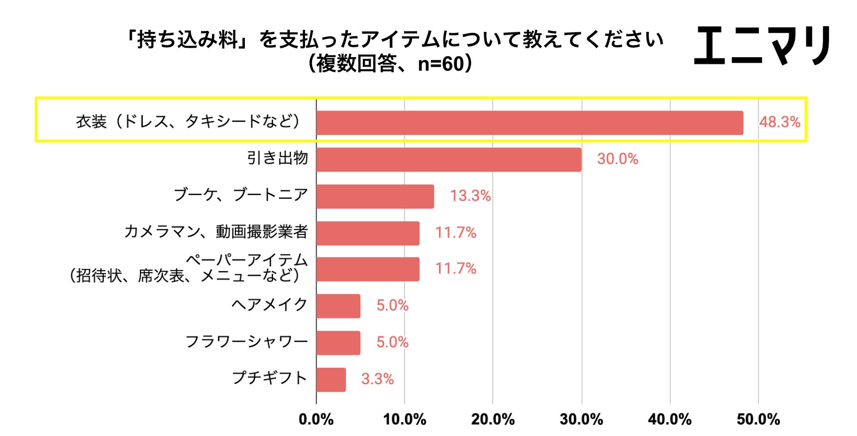 続いて、結婚式において「持ち込み料」を実際に支払った経験があるかについて聞いたところ、支払った経験があるカップルは3割以上でした。「持ち込み料」が発生した主なアイテムは「衣装(ドレス、タキシードなど)」が全体の約5割を占め、続いて多かったアイテムは「引き出物」30.0%、さらに「ブーケ、ブートニア」13.3%、「カメラマン、動画撮影業者」11.7%、「ペーパーアイテム」11.7%が続きました。結婚式において欠かせないと考えられるアイテムに対して「持ち込み料」が発生していることがわかります。