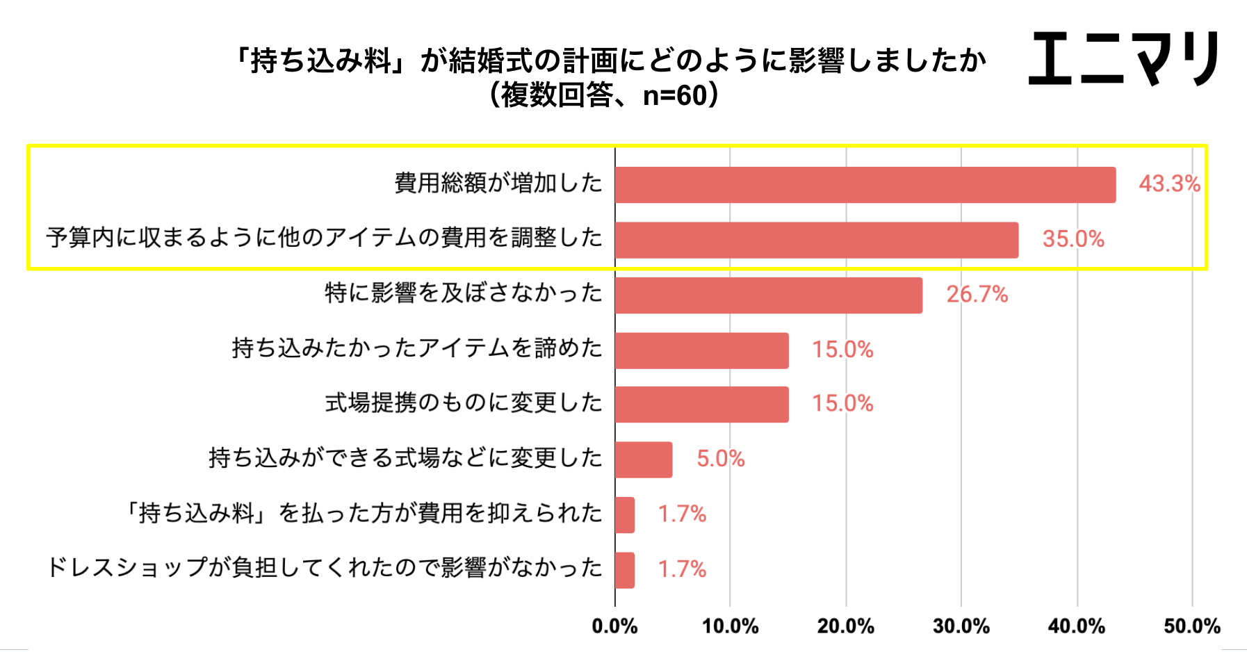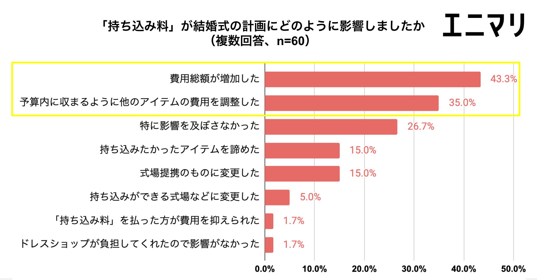 さらに、「持ち込み料」を支払ったカップルに対して、「持ち込み料」が結婚式計画にどのような影響を及ぼしたかを聞いたところ、全体の43.3%が「費用総額が増加した」と回答、次いで「予算内に収まるように他のアイテムの費用を調整した」35.0%という結果になりました。また、「持ち込みたかったアイテムを諦めた」15.0%、「式場提携のものに変更した」15.0%といった回答も見られました。結婚式の「持ち込み料」の存在がカップルの費用計画に様々な影響を与えていることがわかります。