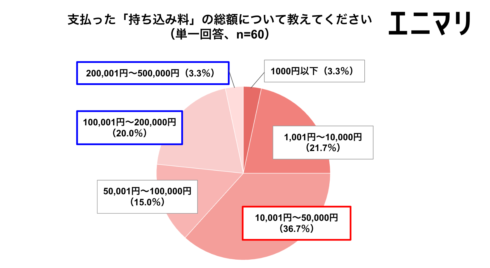 持ち込み料」の総額は「10,001円〜50,000円」が最も多く、2割以上が10万円を超える金額を支払ったと回答