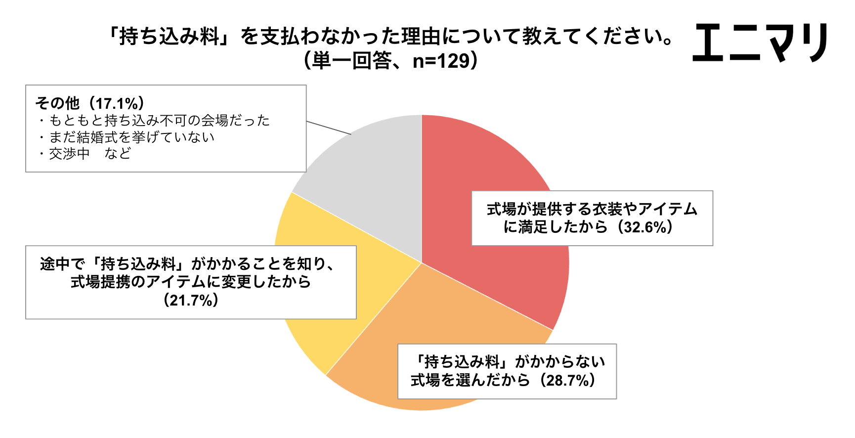 一方で、「持ち込み料」を支払わなかったカップルにその理由を聞いたところ、「式場が提供する衣装やアイテムに満足したから」と答えたカップルが32.6%で最も多く、「『持ち込み料』がかからない式場を選んだから」が28.7%で続きました。また2割以上は「途中で『持ち込み料』がかかることを知り、式場提携のアイテムに変更したから」と回答し、「持ち込み料」に関する情報不足あるいは認識不足によって変更を余儀なくされていることがうかがえます。